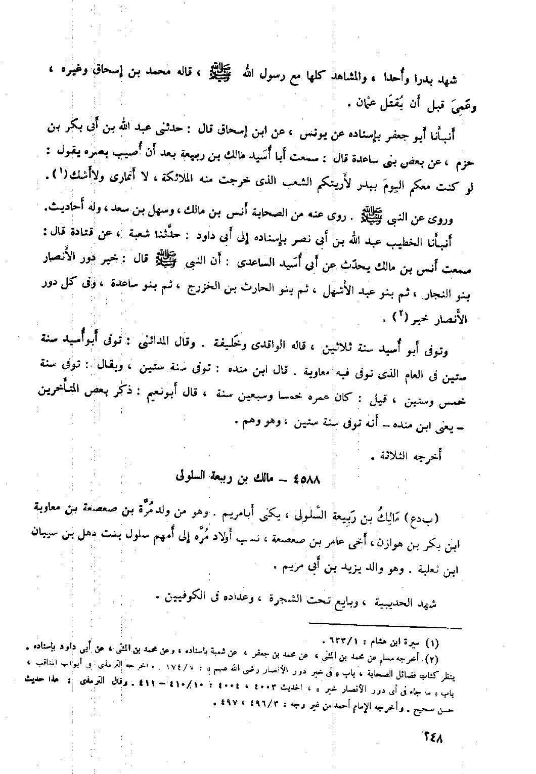 سَمِعْتُ أَنَسَ بْنَ مَالِكٍ يُحَدِّثُ عَنْ أَبِي أُسَيْدٍ السَّاعِدِيِّ: أَنَّ النبي صلّى الله عليه وآله وَسَلَّمَ قَالَ: خَيْرُ دُورِ الأَنْصَارِ بَنُو النَّجَّارِ، ثُمَّ بَنُو عَبْدِ الأَشْهَلِ، ثُمَّ بَنُو الْحَارِثِ بْنِ الْخَزْرَجِ، ثُمَّ بَنُو سَاعِدَةَ، وَفِي كُلِّ دُورِ الأَنْصَارِ خَيْرٌ [٢] . وتوفي أَبُو أسيد سنة ثلاثين، قاله الواقدي وخليفة. وقال الْمَدَائِنيّ: توفي أَبُو أسيد سنة ستين فِي العام الَّذِي توفي فِيهِ معاوية. قَالَ ابن منده: توفي سنة ستين، ويقال: توفي سنة خمس وستين، قيل: كَانَ عمره خمسا وسبعين سنة، قَالَ أبو نعيم: ذكر بعض المتأخرين- يعني ابن منده- أَنَّهُ توفي سنة ستين، وهو وهم.