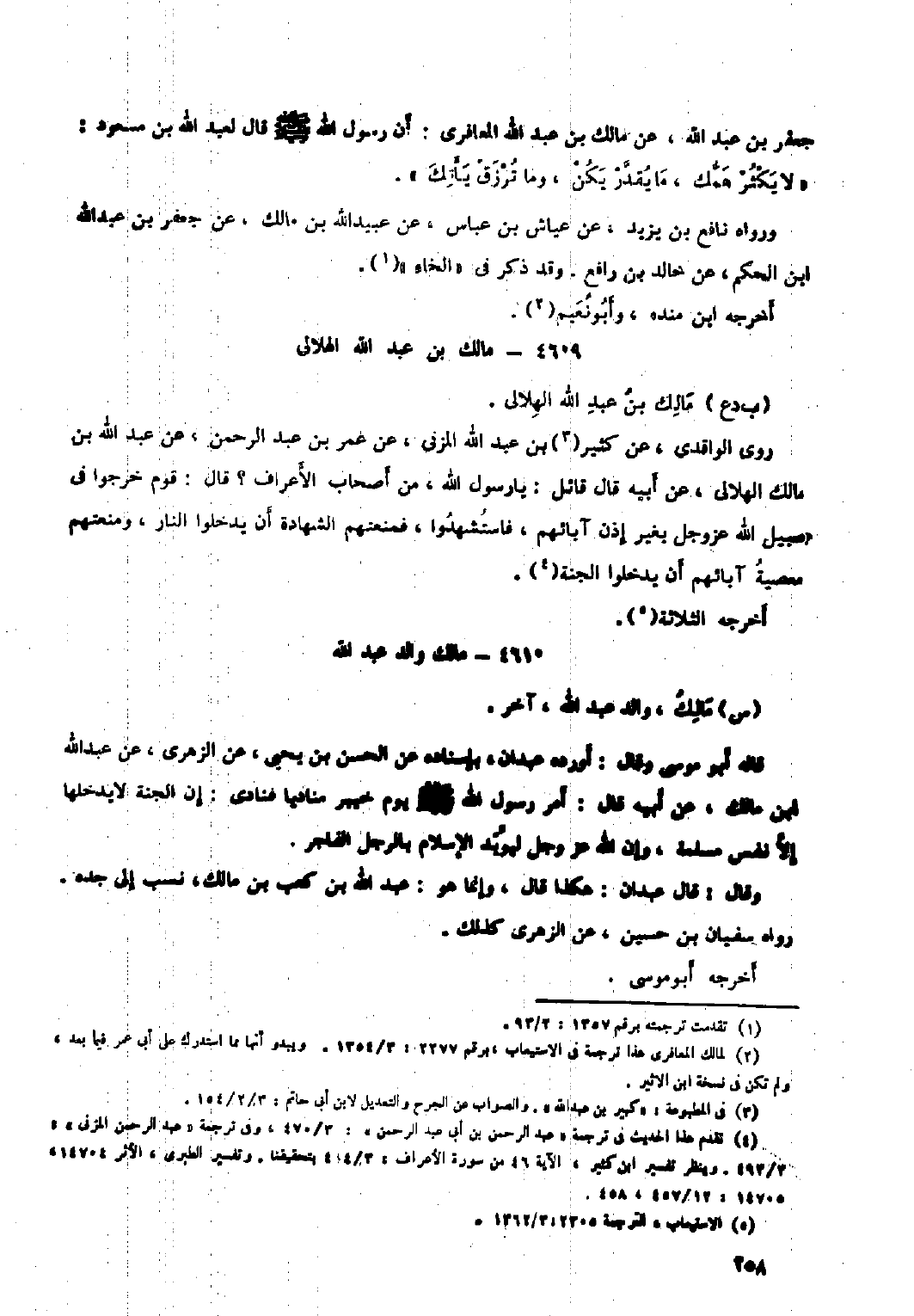 روى الواقدي، عَنْ كَثِير [٣] بْن عَبْد اللَّهِ المزني، عَنْ عمر بْن عَبْد الرَّحْمَن، عَنْ عَبْد اللَّه بْن مالك الهلالي، عَنْ أبيه قَالَ قائل: يا رَسُول اللَّهِ، من أصحاب الأعراف؟ قَالَ: قوم خرجوا فِي سبيل اللَّه عَزَّ وَجَلَّ بغير إذن آبائهم، فاستشهدوا، فمنعتهم الشهادة أن يدخلوا النار، ومنعتهم معصية آبائهم أن يدخلوا الجنة [٤] . أخرجه الثلاثة [٥] .
