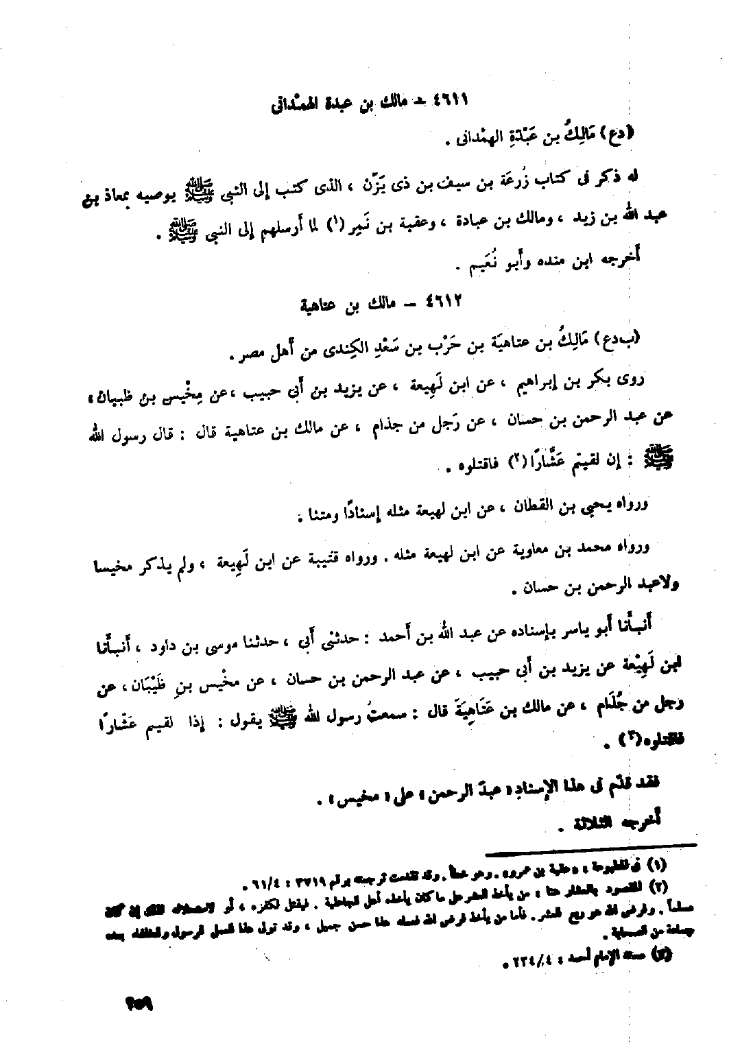 ورواه مُحَمَّد بْن معاوية عَنِ ابن لهيعة مثله. ورواه قُتَيْبَة عَنِ ابن لهيعة، ولم يذكر مخيسا ولا عبد الرحمن بْن حسان. أَنْبَأَنَا أَبُو يَاسِرٍ بِإِسْنَادِهِ عَنْ عَبْدِ اللَّهِ بْنِ أَحْمَدَ: حَدَّثَنِي أَبِي، حَدَّثَنَا مُوسَى بْنُ دَاوُدَ، أَنْبَأَنَا ابْنُ لَهِيعَةَ عَنْ يَزِيدَ بْنِ أَبِي حَبِيبٍ، عَنْ عَبْدِ الرَّحْمَنِ بْنِ حَسَّانٍ، عَنْ مِخْيَسِ بْنِ ظَبْيَانَ، عَنْ رَجُلٍ من جذام، عن مالك بن عتاهية قال: سمعت رسول الله صلى الله عليه وآله وسلّم يقول: إذا لقيم عشّارا فاقتلوه [٣] . فقد قدّم في هَذَا الْإِسْنَادَ «عَبْدُ الرَّحْمَنِ» عَلَى «مِخْيَسٍ» .