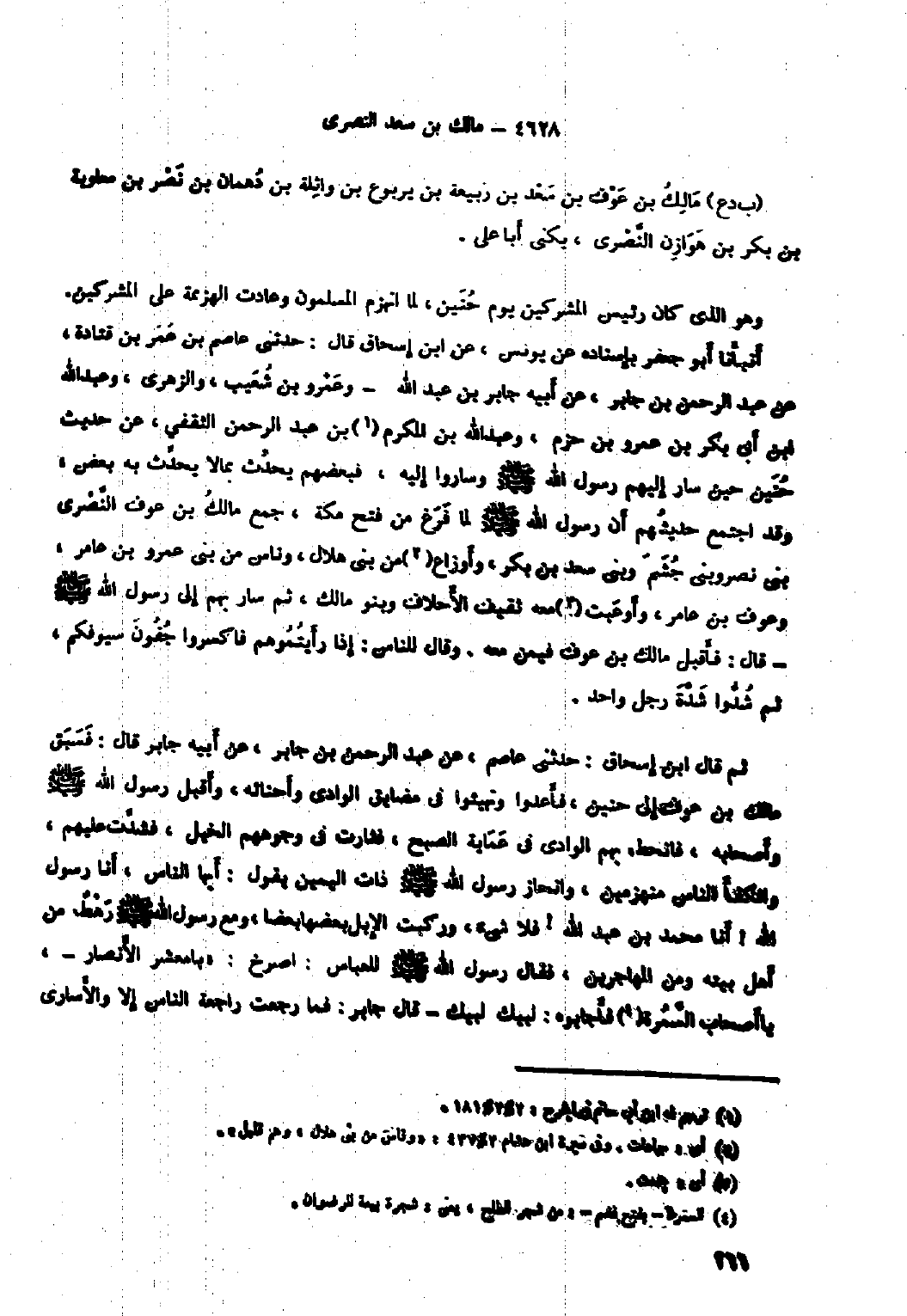 أَنْبَأَنَا أَبُو جَعْفَر بِإِسْنَادِهِ عَنْ يونس، عَنِ ابْنِ إِسْحَاقَ قَالَ: حَدَّثَنِي عَاصِمُ بْنُ عُمَرَ بْنِ قتادة، عن عبد الرحمن بن جابر، عَنْ أَبِيهِ جَابِرِ بْنِ عَبْدِ اللَّهِ- وَعَمْرِو بن شعيب، والزهري، وعبد الله ابن أَبِي بَكْرِ بْنِ عَمْرِو بْنِ حَزْمٍ، وَعَبْدِ اللَّهِ بْنِ الْمُكْرَمِ [١] بْنِ عَبْدِ الرَّحْمَنِ الثَّقَفِيِّ، عَنْ حَدِيثِ حُنَيْنٍ حِينَ سَارَ إِلَيْهِمْ رَسُولُ الله صلّى الله عليه وآله وَسَلَّمَ وَسَارُوا إِلَيْهِ، فَبَعْضُهُمْ يُحَدِّثُ بِمَا لا يُحَدِّثُ بِهِ بَعْضٌ، وَقَدِ اجْتَمَعَ حَدِيثُهُمْ أَنَّ رسول الله صلّى الله عليه وآله وَسَلَّمَ لَمَّا فَرَغَ مِنْ فَتْحِ مَكَّةَ، جَمَعَ مَالِكُ بْنُ عَوْفٍ النَّصْرِيُّ بَنِي نَصْرٍ وَبَنِي جُشَمَ وَبَنِي سَعْدِ بْنِ بَكْرٍ، وَأَوْزَاعَ [٢] مِنْ بنى هلال، وناس مِنْ بَنِي عَمْرِو بْنِ عَامِرٍ، وَعَوْفَ بْنَ عَامِرٍ، وَأَوْعَبَتْ [٣] مَعَهُ ثَقِيفُ الأَحْلافَ وَبَنُو مَالِكٍ، ثُمَّ سَارَ بِهِمْ إِلَى رَسُولِ اللَّهِ صَلَّى الله عليه وآله وَسَلَّمَ- قَالَ: فَأَقْبَلَ مَالِكُ بْنُ عَوْفٍ فِيمَنْ مَعَهُ. وَقَالَ لِلنَّاسِ: إِذَا رَأَيْتُمُوهُمْ فَاكْسِرُوا جُفُونَ سُيُوفِكُمْ، ثُمَّ شُدُّوا شَدَّةَ رَجُلٍ وَاحِدٍ. ثُمَّ قَالَ ابْنُ إِسْحَاقَ: حَدَّثَنِي عَاصِمٌ، عَنْ عَبْدِ الرَّحْمَنِ بْنِ جَابِرٍ، عَنْ أَبِيهِ جَابِرٍ قَالَ: فَسَبَقَ مَالِكُ بْنُ عَوْفٍ إِلَى حُنَيْنٍ، فَأَعَدُّوا وتهيئوا في مضايق الوادي وأحنائه، وأقبل رسول الله صلّى الله عليه وآله وَسَلَّمَ وَأَصْحَابُهُ، فَانْحَطَّ بِهِمُ الْوَادِي فِي عِمَايَةِ الصُّبْحِ، فَثَارَتْ فِي وُجُوهِهُمُ الْخَيْلُ، فَشَدَّتْ عَلَيْهِمْ، وَانْكَفَأَ النَّاسُ مُنْهَزِمِينَ، وَانْحَازَ رَسُولُ اللَّهِ صَلَّى الله عليه وآله وَسَلَّمَ ذَاتَ الْيَمِينِ يَقُولُ: أَيُّهَا النَّاسُ، أَنَا رَسُولُ اللَّهِ! أَنَا مُحَمَّدُ بْنُ عَبْدِ اللَّهِ! فَلا شَيْءَ، وَرَكِبَتِ الإِبِلُ بَعْضَهَا بَعْضًا، وَمَعَ رسول الله صلّى الله عليه وآله وَسَلَّمَ رَهْطٌ مِنْ أَهْلِ بَيْتِهِ وَمِنَ الْمُهَاجِرِينَ، فقال رسول الله صلّى الله عليه وآله وَسَلَّمَ لِلْعَبَّاسِ: اصْرُخْ: «يَا مَعْشَرَ الأَنْصَارِ-، يَا أَصْحَابَ السَّمُرَةِ [٤] فَأَجَابُوهُ: لَبَّيْكَ لَبَّيْكَ- قَالَ جَابِرٌ: فما رجعت راجعة الناس إلا والأسارى