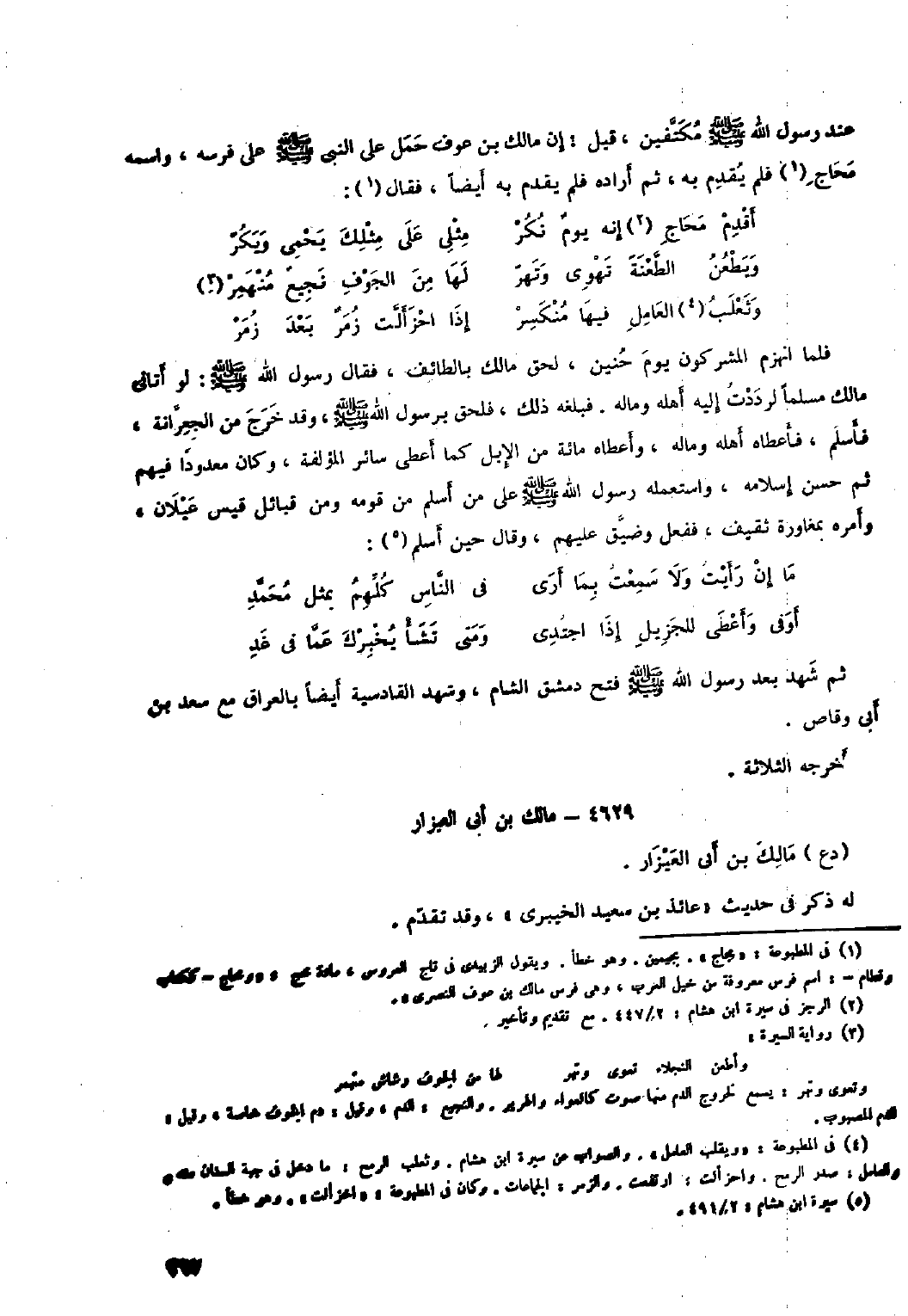 فَلَمَّا انْهَزَمَ الْمُشْرِكُونَ يَوْمَ حُنَيْنٍ، لَحِقَ مَالِكٌ بِالطَّائِفِ، فَقَالَ رَسُولُ اللَّهِ صَلَّى اللَّهُ عليه وآله وَسَلَّمَ: لَوْ أَتَانِي مَالِكٌ مُسْلِمًا لَرَدَدْتُ إِلَيْهِ أَهْلَهُ وَمَالَهُ. فَبَلَغَهُ ذَلِكَ، فَلَحِقَ بِرَسُولِ اللَّهِ صَلَّى اللَّهُ عَلَيْهِ وَسَلَّمَ، وَقَدْ خَرَجَ مِنَ الْجِعْرَانَةِ، فَأَسْلَمَ، فَأَعْطَاهُ أَهْلَهُ وَمَالَهُ، وَأَعْطَاهُ مِائَةً مِنَ الإِبِلِ كَمَا أَعْطَى سَائِرَ الْمُؤَلَّفَةِ، وَكَانَ مَعْدُودًا فِيهِمْ ثُمَّ حَسُنَ إِسْلامُهُ، وَاسْتَعْمَلَهُ رَسُولُ الله صلّى الله عليه وآله وَسَلَّمَ عَلَى مَنْ أَسْلَمَ مِنْ قَوْمِهِ وَمِنْ قَبَائِلِ قَيْسِ عَيْلانَ، وَأَمَرَهُ بِمُغَاوَرَةِ ثَقِيفٍ، فَفَعَلَ وَضَيَّقَ عَلَيْهِمْ، وَقَالَ حِينَ أَسْلَمَ [٥] :
