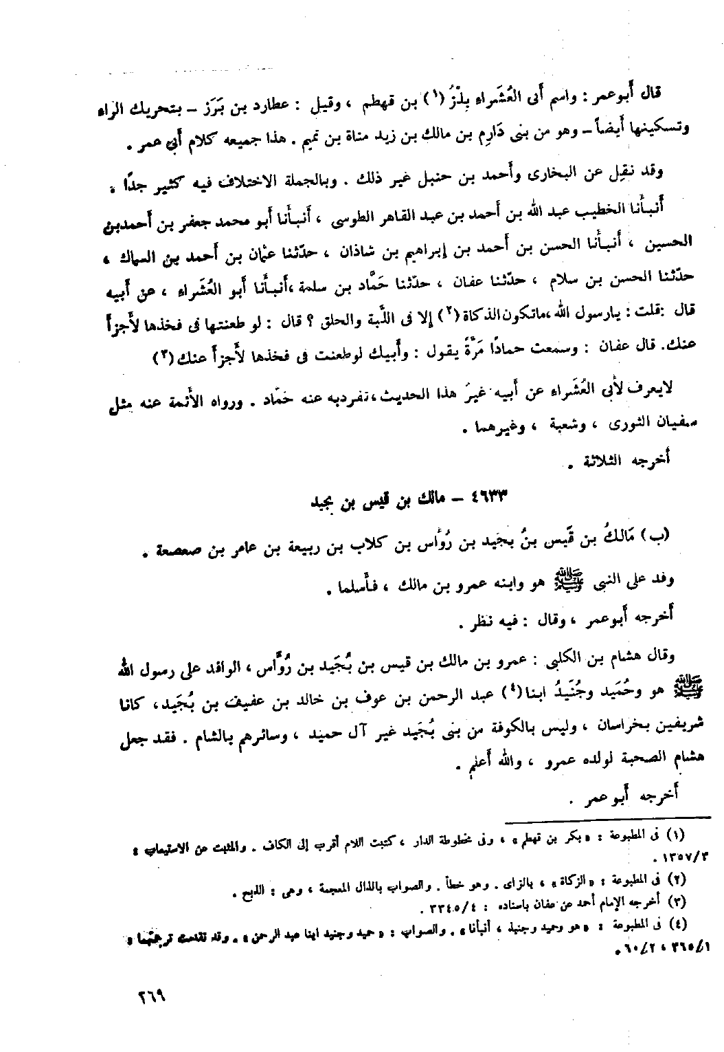 أَنْبَأَنَا الْخَطِيبُ عَبْدُ اللَّهِ بْنُ أَحْمَدَ بْنِ عَبْدِ الْقَاهِرِ الطُّوسِيُّ، أَنْبَأَنَا أَبُو مُحَمَّدٍ جَعْفَرُ بْنُ أَحْمَدَ بْنِ الْحُسَيْنِ، أَنْبَأَنَا الْحَسَنُ بْنُ أَحْمَدَ بْنِ إِبْرَاهِيمَ بْنِ شَاذَانَ، حَدَّثَنَا عُثْمَانُ بْنُ أَحْمَدَ بْنِ السَّمَّاكِ، حَدَّثَنَا الْحَسَنُ بْنُ سَلامٍ، حَدَّثَنَا عَفَّانُ، حَدَّثَنَا حَمَّادُ بْنُ سَلَمَةَ، أَنْبَأَنَا أَبُو الْعَشْرَاءِ، عَنْ أَبِيهِ قَالَ: قُلْتُ: يَا رَسُولَ اللَّهِ، مَا تَكُونُ الذَّكَاةُ [٢] إِلا فِي اللَّبَّةِ وَالْحَلْقِ؟ قَالَ: لَوْ طَعَنْتَهَا فِي فَخِذِهَا لأَجْزَأَ عَنْكَ. قَالَ عَفَّانُ: وَسَمِعْتُ حَمَّادًا مَرَّةً يَقُولُ: وَأَبِيكَ لَوْ طَعَنْتَ فِي فَخِذِهَا لأَجْزَأَ عَنْكَ [٣] . لا يُعْرَفُ لأَبِي الْعَشْرَاءِ عَنْ أَبِيهِ غَيْرُ هَذَا الْحَدِيثِ، تَفَرَّدَ بِهِ عَنْهُ حَمَّادٌ. وَرَوَاهُ الأَئِمَّةُ عَنْهُ مِثْلُ سُفْيَانَ الثَّوْرِيِّ، وَشُعْبَةَ، وَغَيْرِهِمَا.