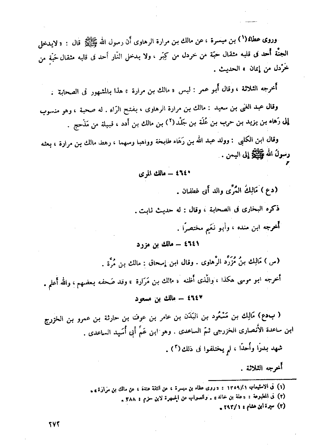 وروي عطاء [١] بْن ميسرة، عَنْ مالك بْن مرارة الرهاوي أن رَسُول اللَّهِ صلى اللَّه عليه وآله وسلم قَالَ: «لا يدخل الجنة أحد فِي قَلْبِهِ مِثْقَالُ حَبَّةٍ مِنْ خَرْدَلٍ مِنْ كبر، ولا يدخل النار أحد فِي قَلْبِهِ مِثْقَالُ حَبَّةٍ مِنْ خَرْدَلٍ مِنْ إيمان» الحديث. أخرجه الثلاثة، وقال أَبُو عمر: لَيْسَ «مالك بْن مرارة» هَذَا بالمشهور فِي الصحابة.