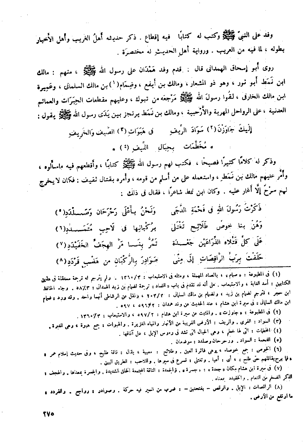 روى أَبُو إِسْحَاقَ الهمداني قَالَ: قَدِمَ وَفْدُ هَمْدَانَ عَلَى رَسُولِ اللَّهِ صَلَّى الله عليه وآله وسلّم، منهم: مالك ابن نمط أَبُو ثور، وهو ذو المشعار، ومالك بْن أيفع، وضمام [١] بْن مالك السلماني، وعميرة ابن مالك الخارفي، لقوا رَسُول اللَّهِ صلى اللَّه عليه وآله وسلم مرجعه من تبوك، وعليهم مقطعات الحبرات والعمائم العدنية، عَلَى الرواحل المهرية والأرحبية، ومالك بْن نمط يرتجز بين يدي رَسُول اللَّهِ صلى الله عليه وآله وسلم يقول: