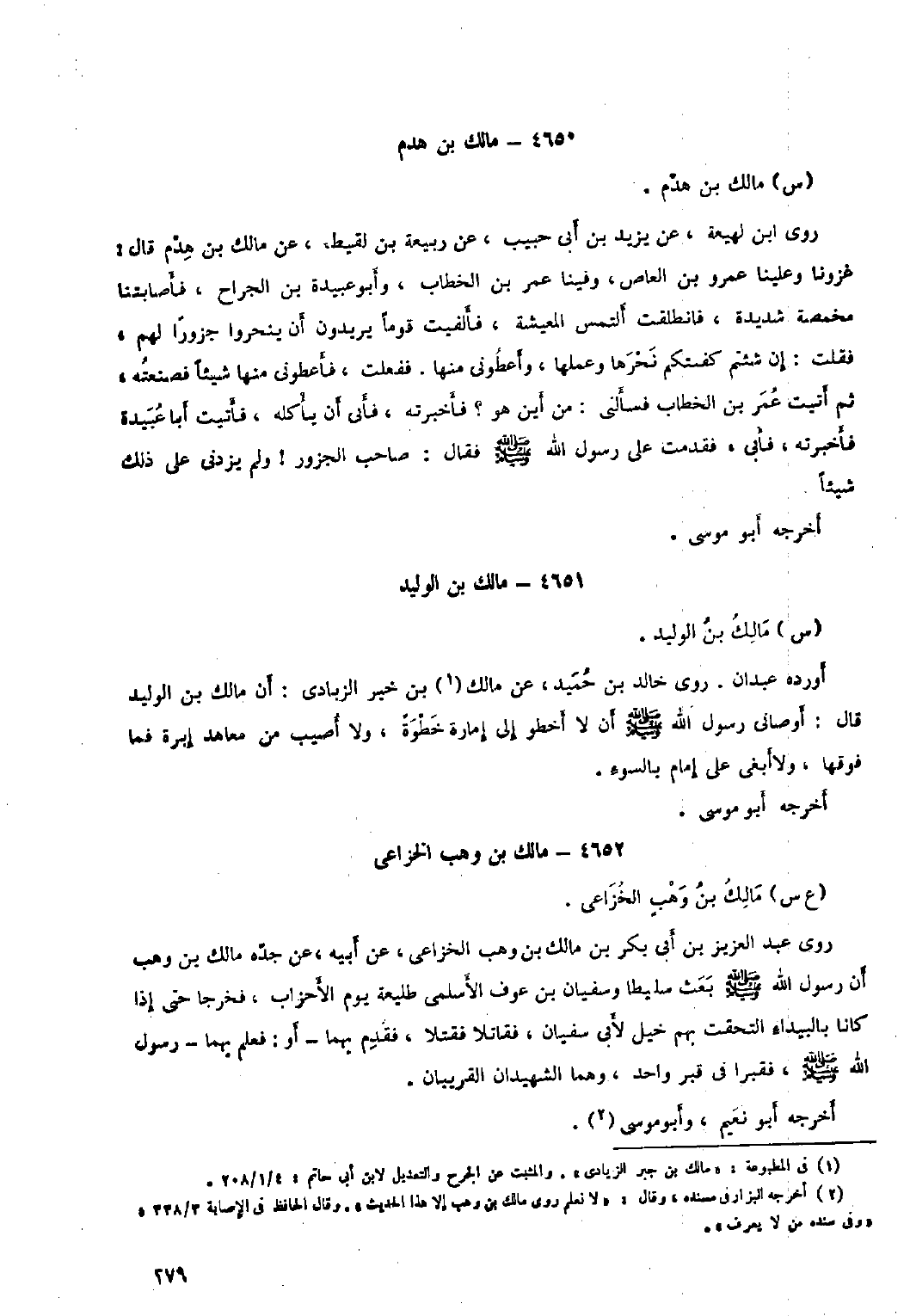 أورده عبدان. روى خَالِد بْن حميد، عَنْ مالك [١] بْن خير الزبادى: أن مالك بْن الْوَلِيد قَالَ: أوصاني رَسُول الله صلّى الله عليه وآله وسلم أن لا أخطو إِلَى إمارة خطوة، ولا أصيب من معاهد إبرة فما فوقها، ولا أبغي عَلَى إمام بالسوء.