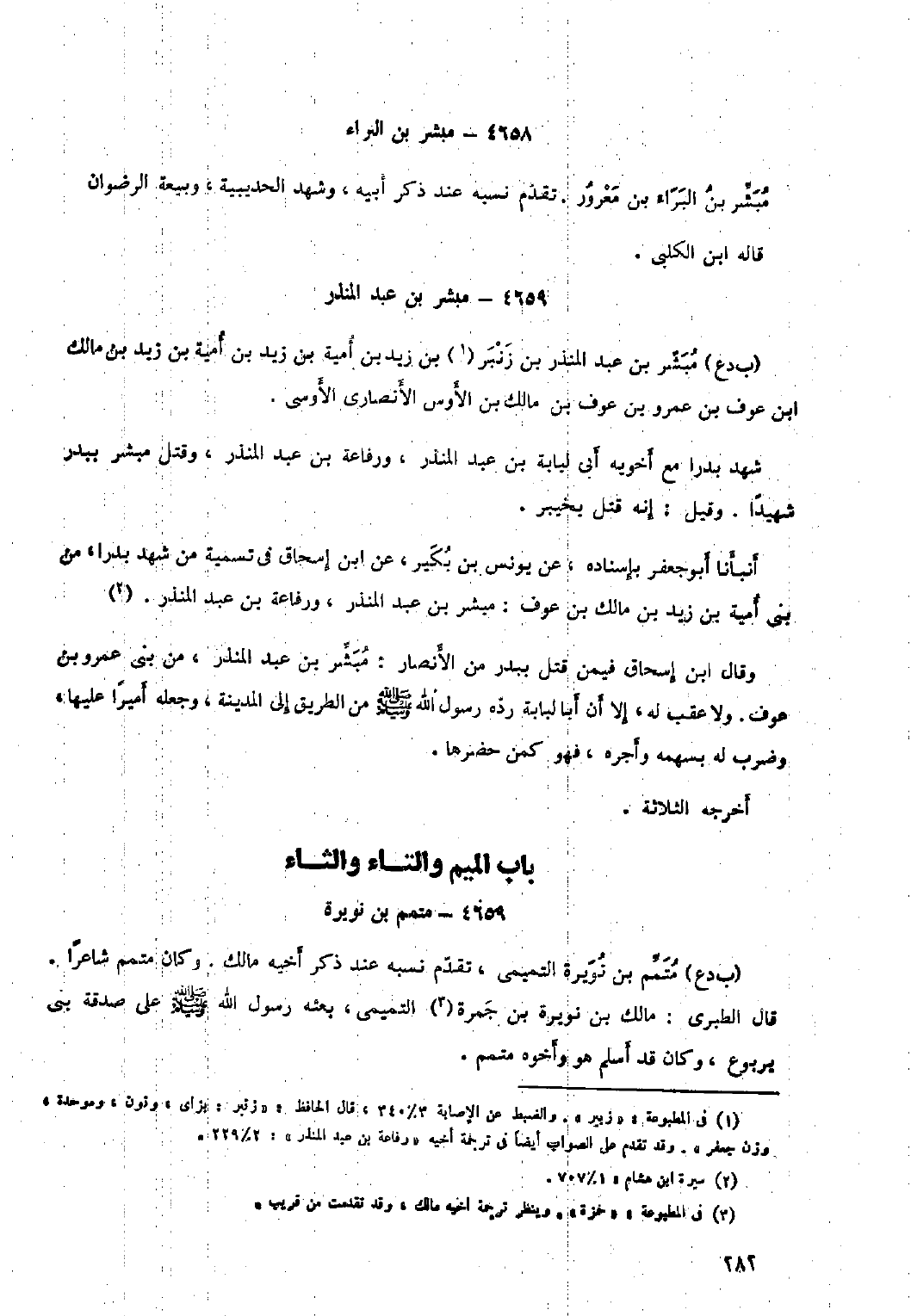 أَنْبَأَنَا أَبُو جَعْفَرٍ بِإِسْنَادِهِ، عَنْ يُونُسَ بْنِ بُكَيْرٍ، عَنِ ابن إِسْحَاق في تسمية من شهد بَدْرًا، مِنْ بَنِي أُمَيَّةَ بْن زَيْد بْن مَالِك بْن عَوْفٍ: مُبَشِّرُ بْن عَبْدِ الْمُنْذِرِ، وَرِفَاعَةُ بْنُ عَبْدِ الْمُنْذِرِ. [٢] وَقَالَ ابْنُ إِسْحَاقَ فِيمَنْ قُتِلَ بِبَدْرٍ مِنَ الأَنْصَارِ: مُبَشِّرُ بْنُ عبد المنذر، من بني عمرو بن عوف. وَلا عَقِبَ لَهُ، إِلا أَنَّ أَبَا لُبَابَةَ ردّه رسول الله صلّى الله عليه وآله وَسَلَّمَ مِنَ الطَّرِيقِ إِلَى الْمَدِينَةِ، وَجَعَلَهُ أَمِيرًا عَلَيْهَا، وَضَرَبَ لَهُ بِسَهْمِهِ وَأَجْرِهِ، فَهُوَ كَمَنْ حَضَرَهَا.