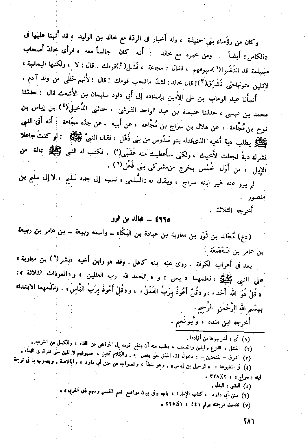 أَنْبَأَنَا عَبْدُ الْوَهَّابِ بْنُ عَلِيٍّ الأَمِينُ بِإِسْنَادِهِ إِلَى أَبِي دَاوُدَ سُلَيْمَانَ بْنِ الأَشْعَثِ قَالَ: حَدَّثَنَا مُحَمَّدُ بْنُ عِيسَى، حَدَّثَنَا عَنْبَسَةُ بْنُ عَبْدِ الْوَاحِدِ الْقُرَشِيُّ، حَدَّثَنِي الدَّخِيلُ [٤] بْنُ إِيَاسِ بْنِ نُوحِ بْنِ مُجَّاعَةَ، عَنْ هِلالِ بْنِ سِرَاجِ بْنِ مُجَّاعَةَ، عَنْ أبيه، عَنْ جَدِّهِ مُجَّاعَةَ: أَنَّهُ أَتَى النَّبِيَّ صَلَّى الله عليه وآله وَسَلَّمَ يَطْلُبُ دِيَةَ أَخِيهِ الَّذِي قَتَلَهُ بَنُو سَدُوسٍ مِنْ بَنِي ذُهْلٍ، فَقَالَ النَّبِيُّ صَلَّى الله عليه وآله وَسَلَّمَ: لَوْ كُنْتَ جَاعِلا لِمُشْرِكٍ دِيَةً لَجَعَلْتُ لأَخِيكَ، وَلَكِنِّي سَأُعْطِيكَ مِنْه عُقْبَى [٥] . فَكَتَبَ لَهُ النبي صلّى الله عليه وآله وَسَلَّمَ بِمِائَةٍ مِنَ الإِبِلِ، مِنْ أَوَّلِ خُمُسٍ يَخْرُجُ مِنْ مُشْرِكِي بَنِي ذُهْلٍ [٦] . لَمْ يَرْوِ عَنْهُ غَيْرُ ابْنِهِ سِرَاجٍ، وَيُقَالُ لَهُ «السُّلَمِيُّ» نِسْبَةً إِلَى جَدِّهِ سُلَيْمٍ، لا إِلَى سُلَيْمِ بن منصور.