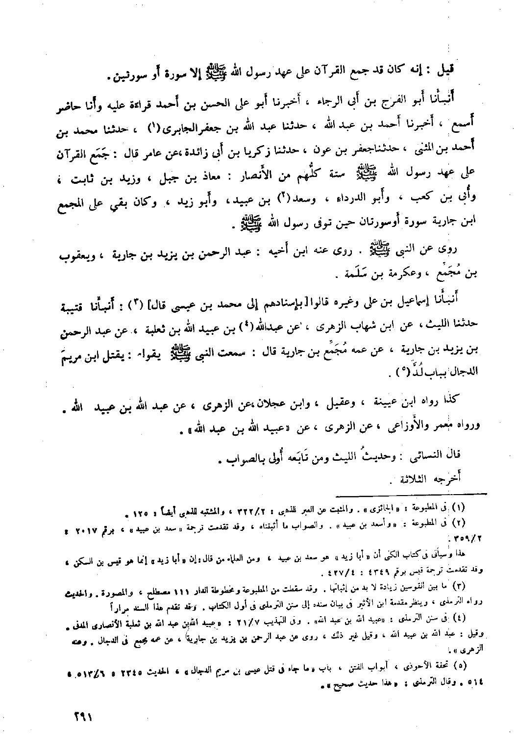 أَنْبَأَنَا أَبُو الفرج بْن أَبِي الرجاء، أَخْبَرَنَا أَبُو عَلِيٍّ الْحَسَنُ بْنُ أَحْمَدَ قِرَاءَةً عَلَيْهِ وَأَنَا حَاضِرٌ أَسْمَعُ، أَخْبَرَنَا أَحْمَدُ بْنُ عَبْدِ اللَّهِ، حَدَّثَنَا عَبْدُ اللَّهِ بْنُ جَعْفَرٍ الْجَابِرِيُّ [١] ، حَدَّثَنَا مُحَمَّدُ بْنُ أحمد بن المثنى، حدثنا جعفر بن عون، حدثنا زكريا بن أَبِي زَائِدَةَ، عَنْ عَامِرٍ قَالَ: جَمَعَ الْقُرْآنَ عَلَى عهد رَسُول اللَّهِ صَلَّى الله عليه وآله وَسَلَّمَ سِتَّةٌ كُلُّهُمْ مِنَ الأَنْصَارِ: مُعَاذُ بْنُ جَبَلٍ، وَزَيْدُ بْنُ ثَابِتٍ، وَأُبَيُّ بْنُ كَعْبٍ، وَأَبُو الدَّرْدَاءِ، وَسَعْدُ [٢] بْنُ عُبَيْدٍ، وَأَبُو زَيْدٍ، وكان بقي على المجمع ابن جَارِيَةَ سُورَةٌ أَوْ سُورَتَانِ حِينَ تُوُفِّيَ رَسُولُ الله صلّى الله عليه وآله وَسَلَّمَ.