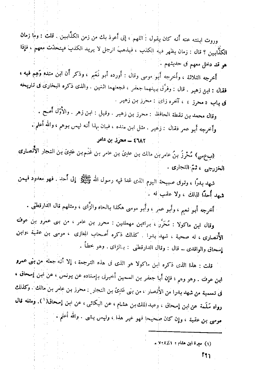 قلت: هَذَا الَّذِي ذكره ابن ماكولا هُوَ الَّذِي فِي هَذِه الترجمة، إلا أنه جعله من بنى عمرو ابن عوف. وهو وهم، فإن أبا جَعْفَر بْن السمين أَخْبَرَنِي بِإِسْنَادِهِ عَنْ يونس، عَنِ ابْنِ إِسْحَاق، فِي تسمية من شهد بدرا من الأنصار، من بني عدي بْن النجار: محرز بْن عَامِر بْن مالك. وكذلك رواه سلمة عَنِ ابن إِسْحَاق، وعبد الملك بْن هِشَام، عَنِ البكائي، عَنِ ابن إِسْحَاق [١] . ومثله قَالَ موسى بْن عقبة، وَإِن كَانَ صحيحا فهو غير هذا، وليس بشيء. والله أعلم.