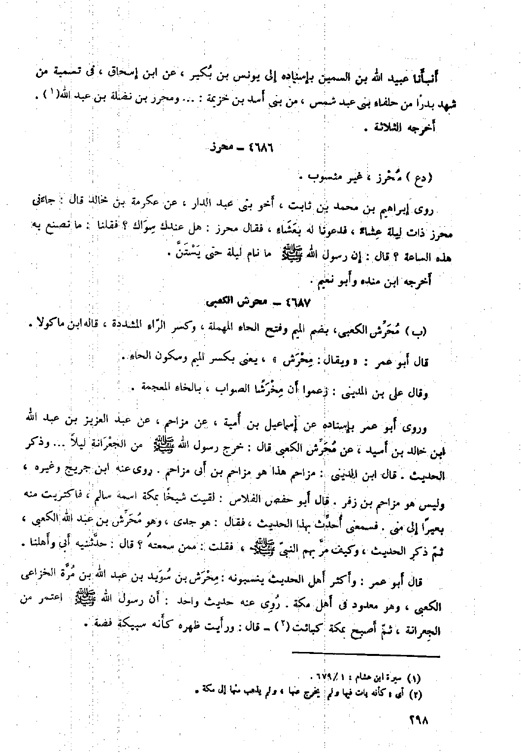 أَنْبَأَنَا عُبَيْدُ اللَّهِ بْنُ السَّمِينِ بِإِسْنَادِهِ إِلَى يُونُسَ بن بكير، عَنِ ابن إِسْحَاق، في تسمية من شهد بدرا من حلفاء بني عَبْدِ شَمْسٍ، مِنْ بَنِي أَسَدِ بْنِ خُزَيْمَةَ: ... وَمُحْرِزِ بْنِ نَضْلَةَ بْنِ عَبْدِ اللَّهِ [١] .