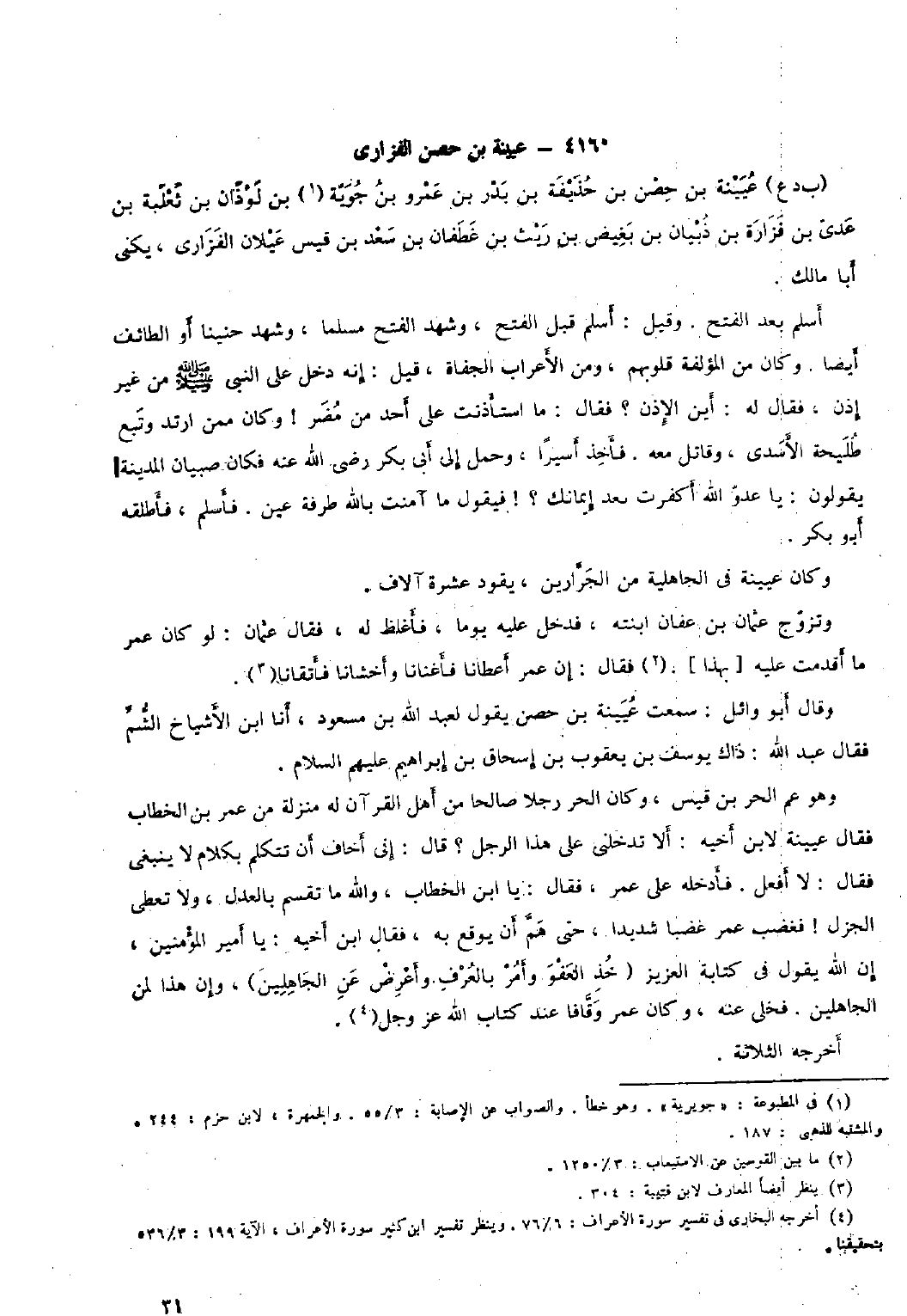 وهو عم الحر بْن قيس، وكان الحر رجلًا صالحًا من أهل القرآن لَهُ منزلة من عُمَر بْن الخطاب فَقَالَ عيينة لابن أخيه: ألا تدخلني عَلَى هَذَا الرجل؟ قَالَ: إني أخاف أن تتكلم بكلام لا ينبغي فَقَالَ: لا أفعل. فأدخله على عمر، فقال: يا ابن الخطاب، والله ما تقسم بالعدل، ولا تعطي الجزل! فغضب عُمَر غضبًا شديدًا، حتَّى هُمْ أن يوقع بِهِ، فَقَالَ ابْن أخيه: يا أمير المؤمنين، إن اللَّه يَقُولُ فِي كتابه العزيز خُذِ الْعَفْوَ وَأْمُرْ بِالْعُرْفِ وَأَعْرِضْ عَنِ الْجاهِلِينَ ٧: ١٩٩، وَإِن هَذَا لمن الجاهلين. فخلى عَنْهُ، وكان عُمَر وقافًا عند كتاب اللَّه عزَّ وجلَّ [٤] .