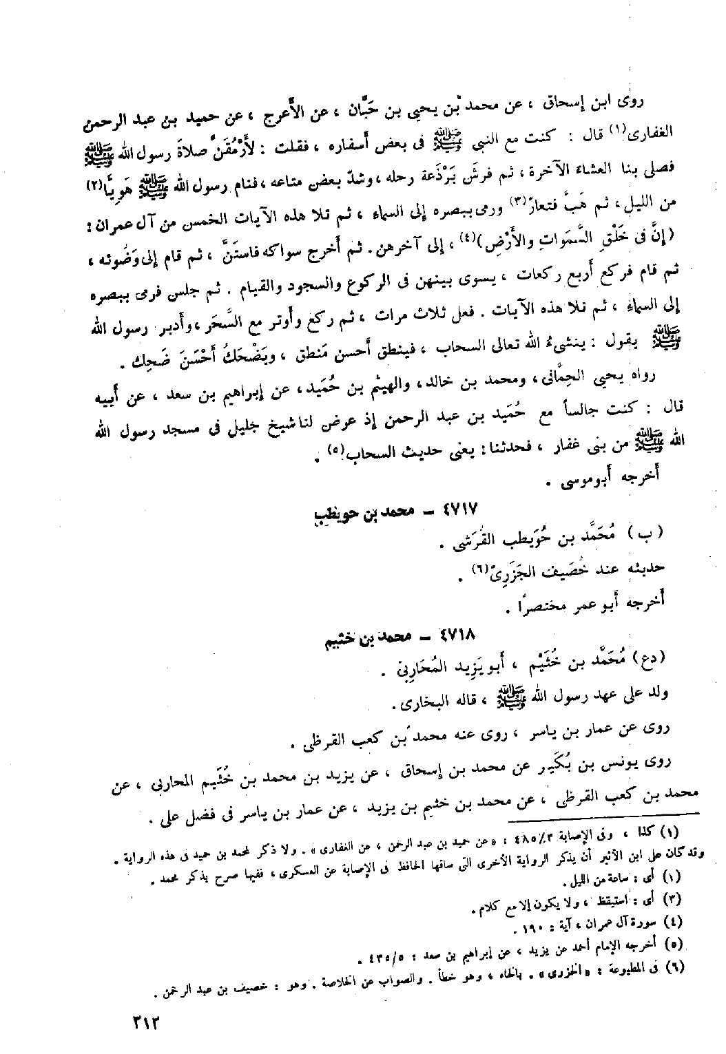 روى ابن إِسْحَاق، عَنْ مُحَمَّدِ بْنِ يَحْيَى بْن حبان، عَنِ الأعرج، عَنْ حميد بْن عبد الرحمن الغفاري [١] قَالَ: كُنْتُ مَعَ النَّبِيّ صَلَّى اللَّهُ عَلَيْهِ وآله وسلم فِي بعض أسفاره، فقلت: لأرمقن صلاة رَسُول اللَّه صَلَّى اللَّهُ عَلَيْهِ وآله وسلم فصلى بنا العشاء الآخرة، ثُمّ فرش برذعة رحله، وشد بعض متاعه، فنام رَسُول الله صلّى الله عليه وآله وسلم هويا [٢] من الليل، ثُمَّ هب فتعار [٣] ورمى ببصره إِلَى السماء، ثُمَّ تلا هَذِه الآيات الخمس من آل عمران: