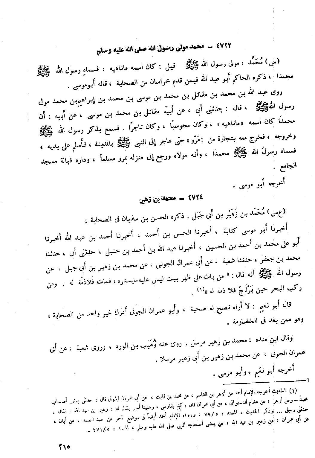 أَخْبَرَنَا أَبُو مُوسَى كِتَابَةً، أَخْبَرَنَا الْحَسَنُ بْنُ أَحْمَدَ، أَخْبَرَنَا أَحْمَدُ بْنُ عبد الله أَخْبَرَنَا أَبُو عَلِيٍّ مُحَمَّدُ بْنُ أَحْمَدَ بْنِ الْحُسَيْنِ، أَخْبَرَنَا عَبْدُ اللَّهِ بْنُ أَحْمَدَ بْنِ حَنْبَلٍ، حدثني أَبِي، حدثنا مُحَمَّد بْن جَعْفَر، حدثنا شعبة، عن أبي عمران الجوني، عن محمد بن زهير بن أبى جبل، عن رسول الله صلّى الله عليه وآله وَسَلَّمَ أَنَّهُ قَالَ: «مَنْ بَاتَ عَلَى ظَهْرِ بَيْتٍ لَيْسَ عَلَيْهِ مَا يَسْتُرُهُ، فَمَاتَ فَلا ذِمَّةَ لَهُ. وَمَنْ رَكِبَ الْبَحْرَ حِينَ يَرْتَجُّ فَلا ذِمَّةَ لَهُ» [١] . قَالَ أَبُو نعيم: لا أراه تصح لَهُ صحبة، وَأَبُو عمران الجوني أدرك غير واحد من الصحابة، وهو ممن يعد فِي الخضارمة.