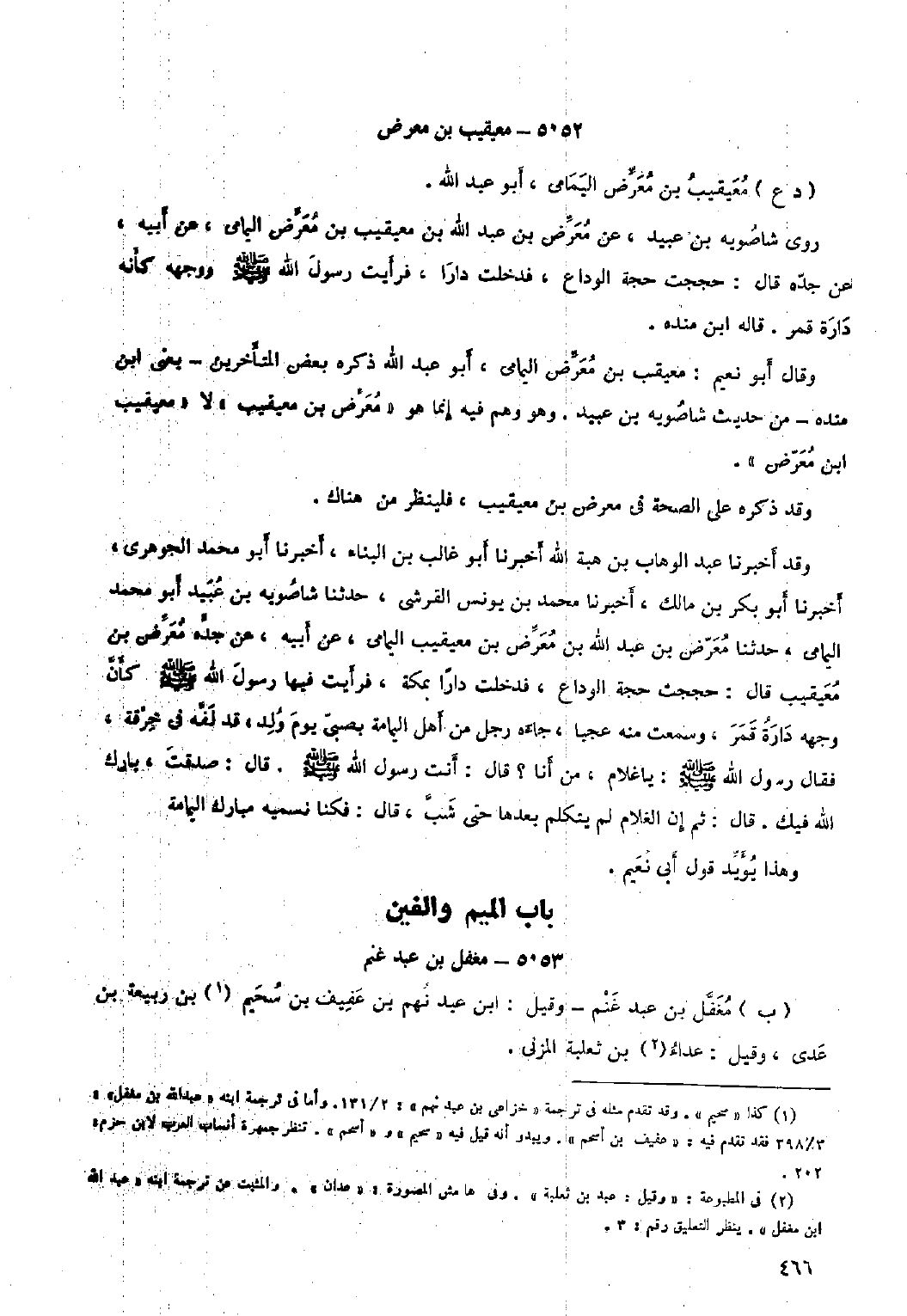 وقد أَخْبَرَنَا عبد الوهاب بْن هبة اللَّه أَخْبَرَنَا أبو غالب بن البناء، أَخْبَرَنَا أَبُو مُحَمَّدٍ الْجَوْهَرِيُّ، أَخْبَرَنَا أَبُو بَكْرٍ بْن مَالِكٍ، أَخْبَرَنَا مُحَمَّدُ بْنُ يُونُسَ الْقُرَشِيُّ، حَدَّثَنَا شَاصُوَيْهِ بْنُ عُبَيْدٍ أبو محمد اليمامي، حَدَّثَنَا معرض بْن عَبْد اللَّهِ بْن معرض بن مُعَيْقِيبٌ الْيَمَامِيُّ، عَنْ أَبِيهِ، عَنْ جَدِّهِ مُعَرِّضِ بْنِ مُعَيْقِيبٍ قَالَ: حَجَجْتُ حِجَّةَ الْوَدَاعِ، فَدَخَلْتُ دارا بمكة، فرأيت فيها رسول الله صلى اللَّهُ عَلَيْهِ وَسَلَّمَ كَأَنَّ وَجْهَهُ دَارَةُ قَمَرٍ، وَسَمِعْتُ مِنْه عَجَبًا، جَاءَهُ رَجُلٌ مِنْ أَهْلِ الْيَمَامَةِ بِصَبِيٍّ يَوْمَ وُلِدَ، قَدْ لَفَّهُ فِي خِرْقَةٍ، فَقَالَ رَسُولُ اللَّهِ صَلَّى اللَّهُ عَلَيْهِ وَسَلَّمَ: يَا غُلامُ، مَنْ أَنَا؟ قَالَ: أَنْتَ رسول الله صلى الله عليه وسلم. قال: صَدَقْتَ، بَارَكَ اللَّهُ فِيكَ. قَالَ: ثُمَّ إِنَّ الْغُلامَ لَمْ يَتَكَلَّمْ بَعْدَهَا حَتَّى شَبَّ، قَالَ: فَكُنَّا نُسَمِّيهِ مُبَارَكَ الْيَمَامَةِ.