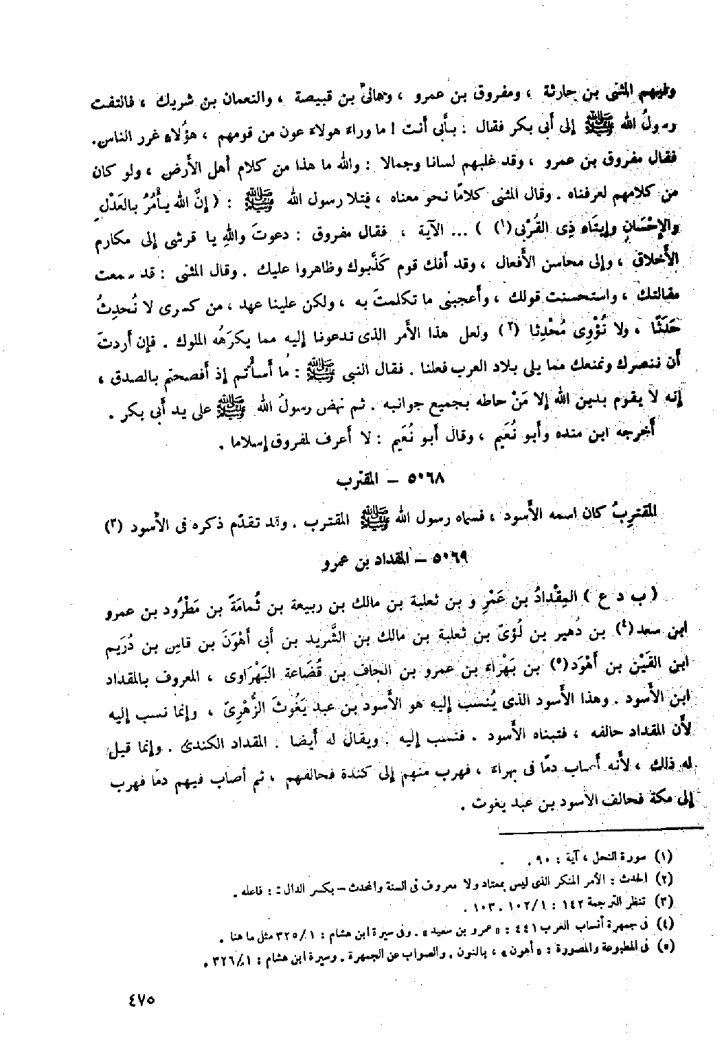 فقال مفروق بْن عَمْرو، وقد غلبهم لسانا وجمالا: والله ما هَذَا من كلام أهل الأرض، ولو كَانَ من كلامهم لعرفناه. وقال المثنى كلاما نحو معناه، فتلا رَسُول اللَّهِ صلى اللَّه عَلَيْهِ وسلم: إِنَّ اللَّهَ يَأْمُرُ بِالْعَدْلِ وَالْإِحْسانِ وَإِيتاءِ ذِي الْقُرْبى ١٦: ٩٠ [١] ... الآية، فقال مفروق: دعوت والله يا قرشي إِلَى مكارم الأخلاق، وَإِلى محاسن الأفعال، وقد أفك قوم كذبوك وظاهروا عليك. وقال المثنى: قد سمعت مقالتك، واستحسنت قولك، وأعجبني ما تكلمت بِهِ، ولكن علينا عهد، من كسرى لا نحدث حدثا، ولا نؤوى محدثا [٢] ولعل هَذَا الأمر الَّذِي تدعونا إليه مما يكرهه الملوك. فإن أردت أن ننصرك ونمنعك مما يلي بلاد العرب فعلنا. فقال النَّبِيّ صلى اللَّه عَلَيْهِ وسلم: ما أسأتم إِذْ أفصحتم بالصدق، إنه لا يقوم بدين اللَّه إلا من حاطه بجميع جوانبه. ثُمَّ نهض رَسُول اللَّهِ صلى اللَّه عَلَيْهِ وسلم عَلَى يد أَبِي بكر. أخرجه ابن منده وَأَبُو نعيم، وقال أَبُو نعيم: لا أعرف لمفروق إسلاما.