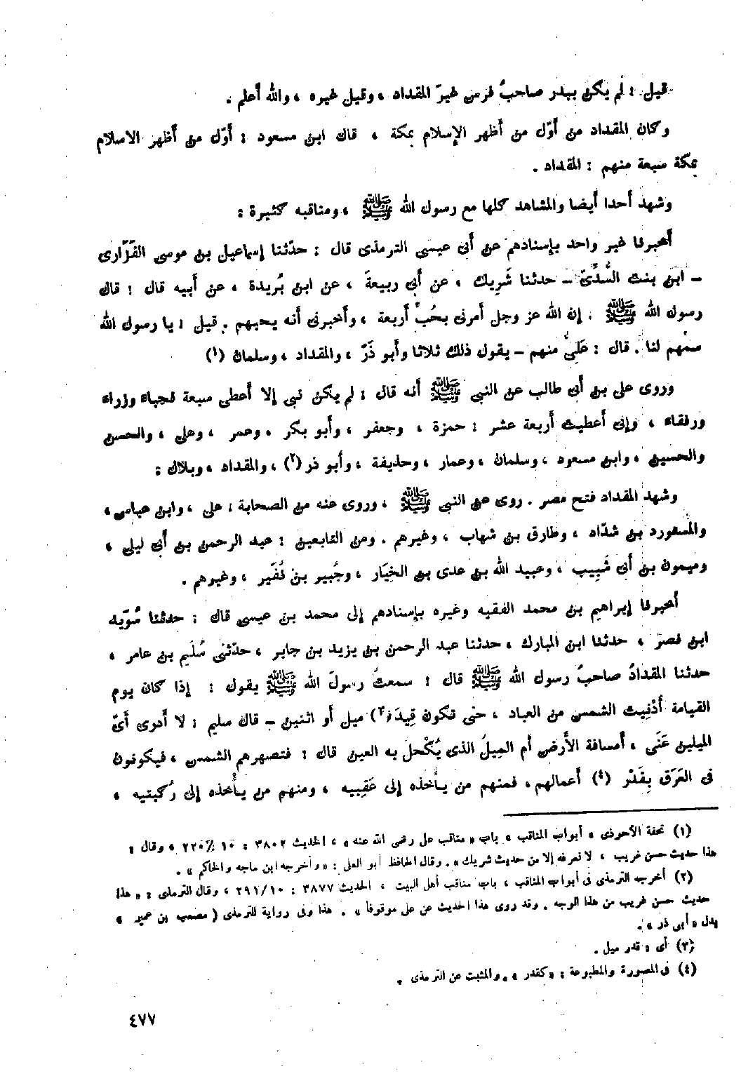أَخْبَرَنَا غَيْرُ وَاحِدٍ بِإِسْنَادِهِمْ عَنْ أَبِي عِيسَى التِّرْمِذِيِّ قَالَ: حَدَّثَنَا إِسْمَاعِيلُ بْنُ مُوسَى الْفَزَارِيُّ- ابْنُ بِنْتِ السُّدِّيِّ- حَدَّثَنَا شَرِيكٌ، عَنْ أَبِي رَبِيعَةَ، عَنِ ابْنِ بُرَيْدَةَ، عَنْ أبيه قال: قال رسول الله صلى الله عليه وسلم أن الله عز وجل أَمَرَنِي بِحُبِّ أَرْبَعَةٍ، وَأَخْبَرَنِي أَنَّهُ يُحِبُّهُمْ. قِيلَ: يَا رَسُولَ اللَّهِ سِمِّهِمْ لَنَا. قَالَ: عَلِيٌّ مِنْهُمْ- يَقُولُ ذَلِكَ ثَلاثًا وَأَبُو ذَرٍّ، وَالْمِقْدَادُ، وَسَلْمَانُ [١] وروي عَليّ بْن أَبِي طالب عَنِ النبي صلى الله عليه وسلم أنه قال: لَمْ يكن نبي إلا أعطي سبعة نجباء وزراء ورفقاء، وَإِني أعطيت أربعة عشر: حَمْزَة، وجعفر، وَأَبُو بكر، وعمر، وَعَليّ، والحسن والحسين، وابن مسعود، وسلمان، وعمار، وحذيفة، وَأَبُو ذر [٢] ، والمقداد، وبلال. وشهد المقداد فتح مصر. روى عَنِ النَّبِيّ صَلَّى اللَّهُ عليه وسلم، وروى عَنْهُ من الصحابة: عَليّ، وابن عباس، والمستورد بْن شداد، وطارق بْن شهاب، وغيرهم. ومن التابعين، عبد الرحمن بْن أَبِي ليلى، وميمون بْن أَبِي شبيب، وعبيد اللَّه بْن عدي بْن الخيار، وجبير بْن نفير، وغيرهم.