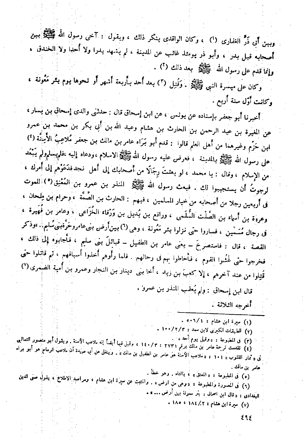 أَخْبَرَنَا أَبُو جَعْفَر بِإِسْنَادِهِ عَنْ يونس، عَنِ ابن إِسْحَاق قال: حدثني وَالِدِي إِسْحَاق بْن يَسَارٍ، عَنِ الْمُغِيرَةِ بْن عَبْدِ الرَّحْمَنِ بْن الْحَارِثِ بْن هِشَامٍ وَعَبْدِ اللَّه بْن أَبِي بكر بن محمد بن عمرو ابن حَزْمٍ وَغَيْرِهِمَا مِنْ أَهْلِ الْعِلْمِ قَالُوا: قَدِمَ أَبُو بَرَاءٍ عَامِرُ بْن مَالِكِ بْن جَعْفَر مُلَاعِبُ الأَسِنَّةِ [٤] عَلَى رَسُولِ اللَّهِ صَلَّى اللَّهُ عَلَيْهِ وَسَلَّمَ بِالْمَدِينَةِ، فَعَرَضَ عَلَيْهِ رَسُول اللَّهِ صَلَّى اللَّهُ عَلَيْهِ وَسَلَّمَ الإِسْلامَ، وَدَعَاهُ إِلَيْهِ، فَلَمْ يُسْلِمْ وَلَمْ يَبْعُدْ مِنَ الإِسْلامِ، وَقَالَ: يَا مُحَمَّد، لَوْ بَعَثْتَ رِجَالا مِنْ أَصْحَابِكَ إِلَى أَهْلِ نَجْدٍ فَدَعَوْهُمْ إِلَى أَمْرِكَ، لَرَجَوْتُ أَنْ يَسْتَجِيبُوا لَكَ. فَبَعَثَ رَسُول اللَّهِ صَلَّى اللَّهُ عَلَيْهِ وَسَلَّمَ الْمُنْذِرَ بْنَ عَمْرِو بْنِ الْمُعْنِقِ [٥] لِلْمَوْتِ فِي أَرْبَعِينَ رَجُلا مِنْ أَصْحَابِهِ مِنْ خِيَارِ الْمُسْلِمِينَ، فِيهِمُ: الْحَارِثُ بْن الصِّمَّةِ، وَحَرَامُ بْن مِلْحَانَ، وَعُرْوَةُ بْنُ أَسْمَاءَ بْنِ الصَّلْتِ السُّلَمِيُّ، وَرَافِعُ بْنُ بُدَيْلِ بْنِ وَرْقَاءَ الْخُزَاعِيُّ، وَعَامِرُ بْنُ فُهَيْرَةَ، فِي رِجَالٍ مُسَمِّينَ، فَسَارُوا حَتَّى نَزَلُوا بِئْرَ مَعُونَةَ، وَهِيَ [٦] بَيْنَ أرض بنى عامر وحرّة بَنِي سُلَيْمٍ..» وَذَكَرَ الْقِصَّةَ، قَالَ: فَاسْتَصْرَخَ- يَعْنِي عَامِرَ بْنَ الطُّفَيْلِ- قَبَائِلَ بَنِي سُلَيْمٍ، فَأَجَابُوهُ إِلَى ذَلِكَ، فَخَرَجُوا حَتَّى غَشُوا الْقَوْمَ، فَأَحَاطُوا بِهِمْ فِي رِحَالِهِمْ. فَلَمَّا رَأَوْهُمْ أَخَذُوا أَسْيَافَهُمْ، ثم قاتلوا حتى قتلوا من عندهم آخِرِهِمْ، إِلا كَعْبَ بْنَ زَيْدٍ، أَخَا بَنِي دِينَارِ بْنِ النَّجَّارِ وَعَمْرَو بْنَ أُمَيَّةَ الضَّمْرِيُّ [٧] قَالَ ابْنُ إِسْحَاقَ: وَلَمْ يُعْقَبِ الْمُنْذَرُ بْنُ عمرو.