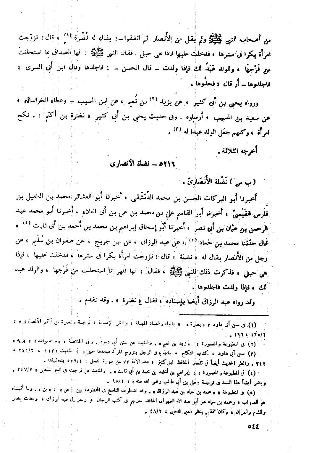 أَخْبَرَنَا أَبُو الْبَرَكَاتِ الْحَسَنُ بْنُ مُحَمَّدِ الدِّمَشْقِيُّ، أَخْبَرَنَا أَبُو الْعَشَائِرِ مُحَمَّدُ بْنُ الْخَلِيلِ بْنِ فَارِسٍ الْقَيْسِيُّ، أَخْبَرَنَا أَبُو الْقَاسِمِ عَلِيُّ بْنُ مُحَمَّدِ بْنِ عَلِيِّ بْنِ أَبِي الْعَلاءِ، أَخْبَرَنَا أَبُو مُحَمَّدٍ عَبْدُ الرَّحْمَنِ بْنُ عُثْمَانَ بْنِ أَبِي نَصْرٍ، أَخْبَرَنَا أَبُو إِسْحَاقَ إِبْرَاهِيمُ بْنُ مُحَمَّدِ بْنِ أَحْمَدَ بْنِ أَبِي ثَابِتٍ [٤] ، قَالَ حَدَّثَنَا مُحَمَّد بن حماد [٥] ، عن عبد الرزاق، عن ابن جريج، عن صفوان بن سُلَيْم، عن رجل من الأنصار يقال لَهُ «نضلة» قَالَ: تزوجت امرأة بكرا فِي سترها، فدخلت عليها، فإذا هي حبلى، فَذَكَرْتُ ذَلِكَ لِلنَّبِيِّ صَلَّى اللَّهُ عَلَيْهِ وَسَلَّمَ، فقال: لَهَا المهر بما استحللت من فرجها، والولد عبد لك، فإذا ولدت فاجلدوها.