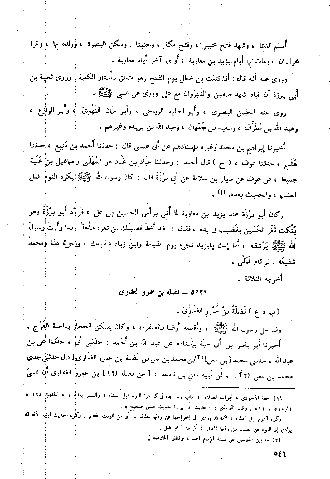 أخبرنا أبو ياسر بن أبي حبة بإسناده عن عبد الله بن أحمد: حَدَّثَنِي أبي، حَدَّثَنَا عَلِيِّ بْنِ عَبْدِ اللَّهِ، حَدَّثَنِي مُحَمَّدُ [بْنُ معن] [٢] بن مُحَمَّد بن معن بن نضلة بن عَمْرو الغفاري [قَالَ حَدَّثَنِي جدي مُحَمَّد [بن معن [٢]] ، عن أبيه معن بن نضلة، [عن نضلة [٢]] بن عَمْرو الغفاريّ أن النبيّ