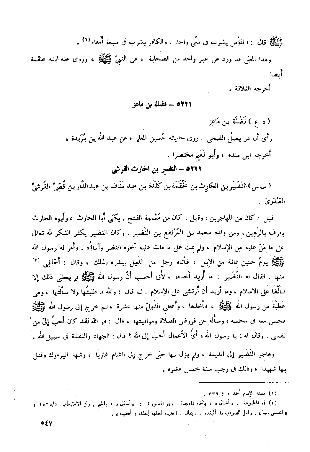 صلى الله عَلَيْهِ وسلم قَالَ: «المؤمن يشرب في معى واحد. والكافر يشرب فِي سبعة أمعاء [١] . وهذا المعنى قد ورد عن غير واحد من الصحابة. عن النبي صلى الله عليه وسلم، وروى عنه ابنه علقمة أيضا.