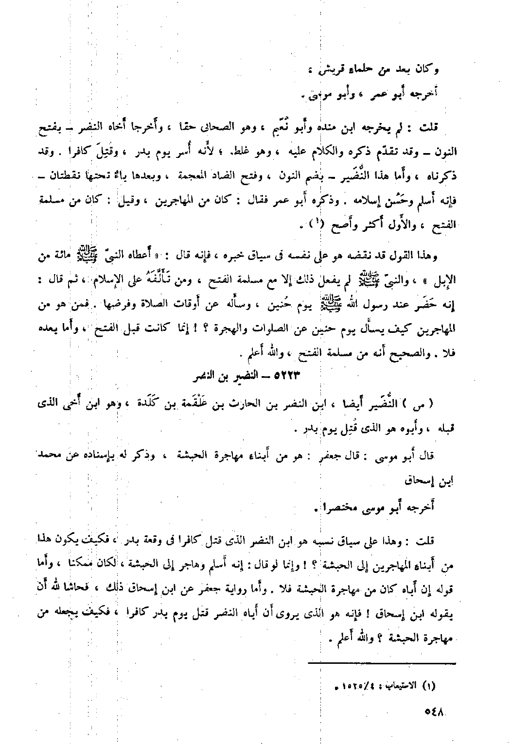 قلت: وهذا عَلَى سياق نسبه هُوَ ابن النضر الَّذِي قتل كافرا فِي وقعة بدر، فكيف يكون هَذَا من أبناء المهاجرين إلى الحبشة؟! وإنما لو قَالَ: إنه أسلم وهاجر إلى الحبشة، لكان ممكنا، وأما قَوْله إن أباه كَانَ من مهاجرة الحبشة فلا. وأما رواية جَعْفَر عن ابن إسحاق ذلك، فحاشا للَّه أن يقوله ابن إسحاق! فإنه هُوَ الَّذِي يروي أن أباه النضر قتل يوم بدر كافرا، فكيف يجعله من مهاجرة الحبشة؟ والله أعلم.