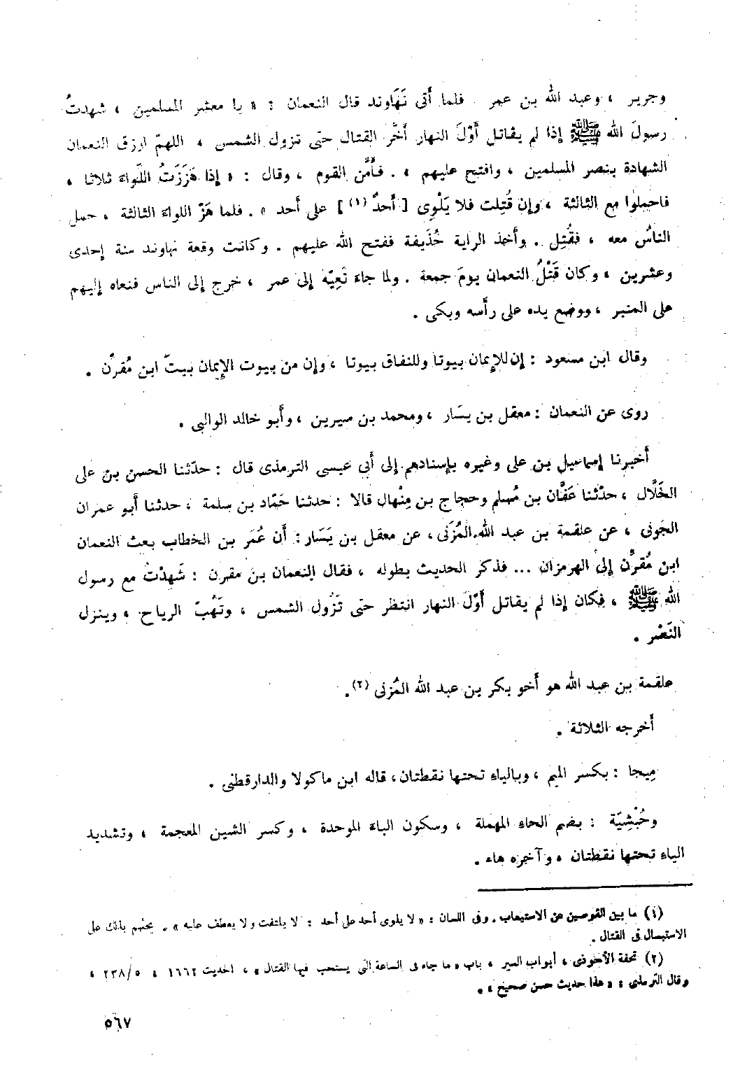 أَخْبَرَنَا إِسْمَاعِيلُ بْنِ عَلِيٍّ وَغَيْرُهُ بِإِسْنَادِهِمْ إِلَى أَبِي عِيسَى التِّرْمِذِيِّ قَالَ: حَدَّثَنَا الْحَسَنُ بْنُ عَليّ الخلال، حَدَّثَنَا عفان بن مسلم وحجاج بن منهال قالا: حَدَّثَنَا حماد بن سلمة، حَدَّثَنَا أبو عمران الجوني، عن علقمة بن عبد الله المزني، عن معقل بن يسار: أن عمر بن الخطاب بعث النعمان ابن مقرن إلى الهرمزان ... فذكر الحديث بطوله، فقال النعمان بن مقرن: شهدت مَعَ رَسُول اللَّهِ صَلَّى اللَّهُ عَلَيْهِ وسلم، فكان إذا لَمْ يقاتل أول النهار انتظر حَتَّى تزول الشمس، وتهب الرياح، وينزل النصر.
