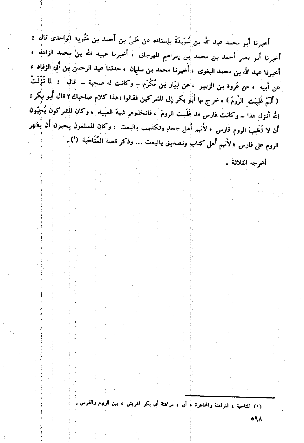 [١] المناحبة: المراهنة والمخاطرة، أي: مراهنة أبى بكر لقريش، بين الروم والفرس.