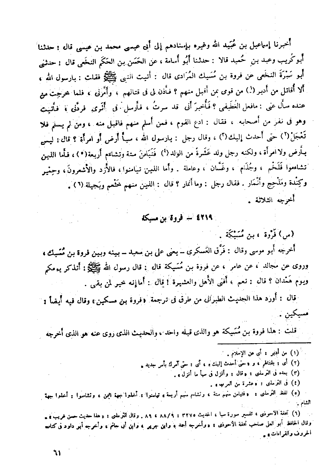 أَخْبَرَنَا إِسْمَاعِيلُ بْنُ عُبَيْدِ اللَّهِ وَغَيْرُهُ بِإِسْنَادِهِمْ إِلَى أَبِي عِيسَى مُحَمَّدِ بْنِ عِيسَى قَالَ: حَدَّثَنَا أَبُو كُرَيْبٍ وَعَبْدُ بْنُ حُمَيْدٍ قَالا: حَدَّثَنَا أَبُو أُسَامَةَ، عَنِ الْحَسَنِ بْنِ الْحَكَمِ النخعي قال: حدثني أبو سيرة النَّخَعِيُّ عَنْ فَرْوَةَ بْنِ مُسَيْكٍ الْمُرَادِيِّ قَالَ: أتيت النبي صلّى الله عليه وآله وَسَلَّمَ فَقُلْتُ: يَا رَسُولَ اللَّهِ، أَلا أُقَاتِلُ مَنْ أَدْبَرَ [١] مِنْ قَوْمِي بِمَنْ أَقْبَلَ مِنْهُمْ؟ فَأَذِنَ لِي فِي قِتَالِهِمْ، وَأَمَرَنِي، فَلَمَّا خَرَجْتُ مِنْ عِنْدِهِ سَأَلَ عَنِّي: مَا فَعَلَ الْغُطَيْفِيُّ؟ فَأُخْبِرَ أَنِّي قَدْ سِرْتُ، فَأَرْسَلَ فِي أَثَرِي فَرَدَّنِي، فَأَتَيْتُ وَهُوَ فِي نَفَرٍ مِنْ أَصْحَابِهِ، فَقَالَ: ادْعُ الْقَوْمَ، فَمَنْ أَسْلَمَ مِنْهُمْ فَأَقْبَلَ مِنْهُ، وَمَنْ لَمْ يُسْلِمْ فَلا تَعْجَلْ [٢] حَتَّى أُحَدِّثَ إِلَيْكَ [٣] ، وَقَالَ رَجُلٌ: يَا رَسُولَ اللَّهِ، سَبَأٌ أَرْضٌ أَوِ امْرَأَةٌ؟ قَالَ: لَيْسَ بِأَرْضٍ وَلا امْرَأَةٍ، وَلَكِنَّهُ رَجُلٌ وَلَدَ عَشَرَةً مِنَ الْوَلَدِ [٤] فَتَيَامَنَ سِتَّةً وَتَشَاءَمَ أَرْبَعَةً [٥] ، فَأَمَّا الَّذِينَ تَشَاءَمُوا فَلَخْمٌ، وَجُذَامُ، وَغَسَّانُ، وَعَامِلَةُ. وَأَمَّا الَّذِينَ تَيَامَنُوا، فَالأَزْدُ وَالأَشْعَرُونَ، وَحِمْيَرُ وَكِنْدَةُ وَمَذْحِجُ وَأَنْمَارُ. فَقَالَ رَجُلٌ: وَمَا أَنْمَارُ؟ قَالَ: الَّذِينَ مِنْهُمْ خثعم وبجيلة [٦] . أخرجه الثلاثة.