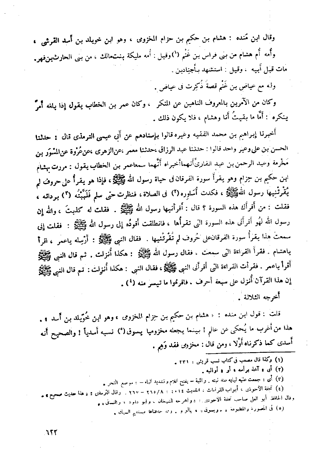 أخبرنا إِبْرَاهِيمُ بْنُ مُحَمَّدٍ الْفَقِيهُ وَغَيْرُهُ قَالُوا بِإِسْنَادِهِمْ عَنْ أَبِي عِيسَى التِّرْمِذِيِّ قَالَ: حَدَّثَنَا الْحَسَن بن عَليّ وغير واحد قالوا: حَدَّثَنَا عبد الرزاق، حَدَّثَنَا معمر، عَنِ الزُّهْرِيّ، عن عروة عَنِ الْمِسْوَرِ بْنِ مَخْرَمَةَ وَعَبْدِ الرَّحْمَنِ بْنِ عبد القاري أنهما أخبراه أنهما سمعا عمر بن الخطاب يقول: مررت بهشام ابن حكيم بن حزام وهو يقرأ سورة الفرقان في حياة رَسُول اللَّهِ صَلَّى اللَّهُ عَلَيْهِ وسلم، فإذا هُوَ يقرأ عَلَى حروف لَمْ يقرئنيها رسول الله صلى الله عَلَيْهِ وسلم، فكدت أساوره [٢] فِي الصلاة، فنظرت حَتَّى سلم فلببته [٣] بردائه، فقلت: من أقرأك هَذِه السورة؟ قَالَ: أقرأنيها رسول الله صلى الله عَلَيْهِ وسلم. فقلت لَهُ كذبت، والله إن رسول الله لهو أقرأني هَذِه السورة التي تقرأها، فانطلقت أقوده إلى رسول الله صلى الله عَلَيْهِ وسلم: فقلت إِنِّي سمعت هَذِا يقرأ سورة الفرقان عَلَى حروف لَمْ تقرئنيها. فقال النَّبِيّ صلى الله عَلَيْهِ وسلم: أرسله يا عمر، اقرأ يا هِشَام. فقرا القراءة التي سمعت، فقال رسول الله صلى الله عليه وسلم: هكذا أنزلت. ثُمَّ قَالَ النَّبِيّ صَلَّى اللَّهُ عَلَيْهِ وَسَلَّمَ اقرأ يا عمر. فقرأت القراءة التي أقرأني النَّبِيّ صَلَّى اللَّهُ عَلَيْهِ وَسَلَّمَ، فقال النَّبِيّ: هكذا أنزلت: ثُمَّ قَالَ النَّبِيّ صَلَّى اللَّهُ عَلَيْهِ وَسَلَّمَ إن هَذَا القرآن أنزل عَلَى سبعة أحرف، فاقرءوا ما تيسر مِنْه [٤] . أخرجه الثلاثة.