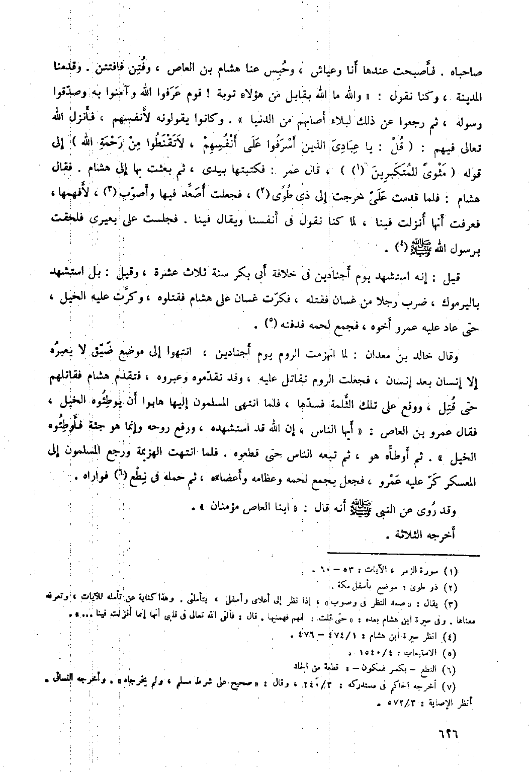 صاحباه. فأصبحت عندها أنا وعياش، وحبس عنا هِشَام بن العاص، وفتن فافتتن. وقدمنا المدينة، وكنا نقول: «والله ما الله بقابل من هؤلاء توبة! قوم عرفوا الله وآمنوا بِهِ وصدقوا رسوله، ثُمَّ رجعوا عن ذَلِكَ لبلاء أصابهم من الدُّنْيَا» . وكانوا يقولونه لأنفسهم، فأنزل الله تعالى فِيهِم: قُلْ: يَا عِبادِيَ الَّذِينَ أَسْرَفُوا عَلى أَنْفُسِهِمْ، لا تَقْنَطُوا مِنْ رَحْمَةِ الله ٣٩: ٥٣ إلى قوله مَثْوىً لِلْمُتَكَبِّرِينَ ٣٩: ٦٠ [١] ، قَالَ عمر: فكتبتها بيدي، ثُمَّ بعثت بِهَا إلى هِشَام. فقال هِشَام: فلما قدمت عَلَي خرجت إلى ذي طوى [٢] ، فجعلت أصعّد فيها وأصوب [٣] ، لأفهمها، فعرفت أنها أنزلت فينا، لِمَا كنا نقول فِي أنفسنا ويقال فينا. فجلست عَلَى بعيري فلحقت برسول اللَّهِ صَلَّى اللَّهُ عَلَيْهِ وَسَلَّمَ [٤] .