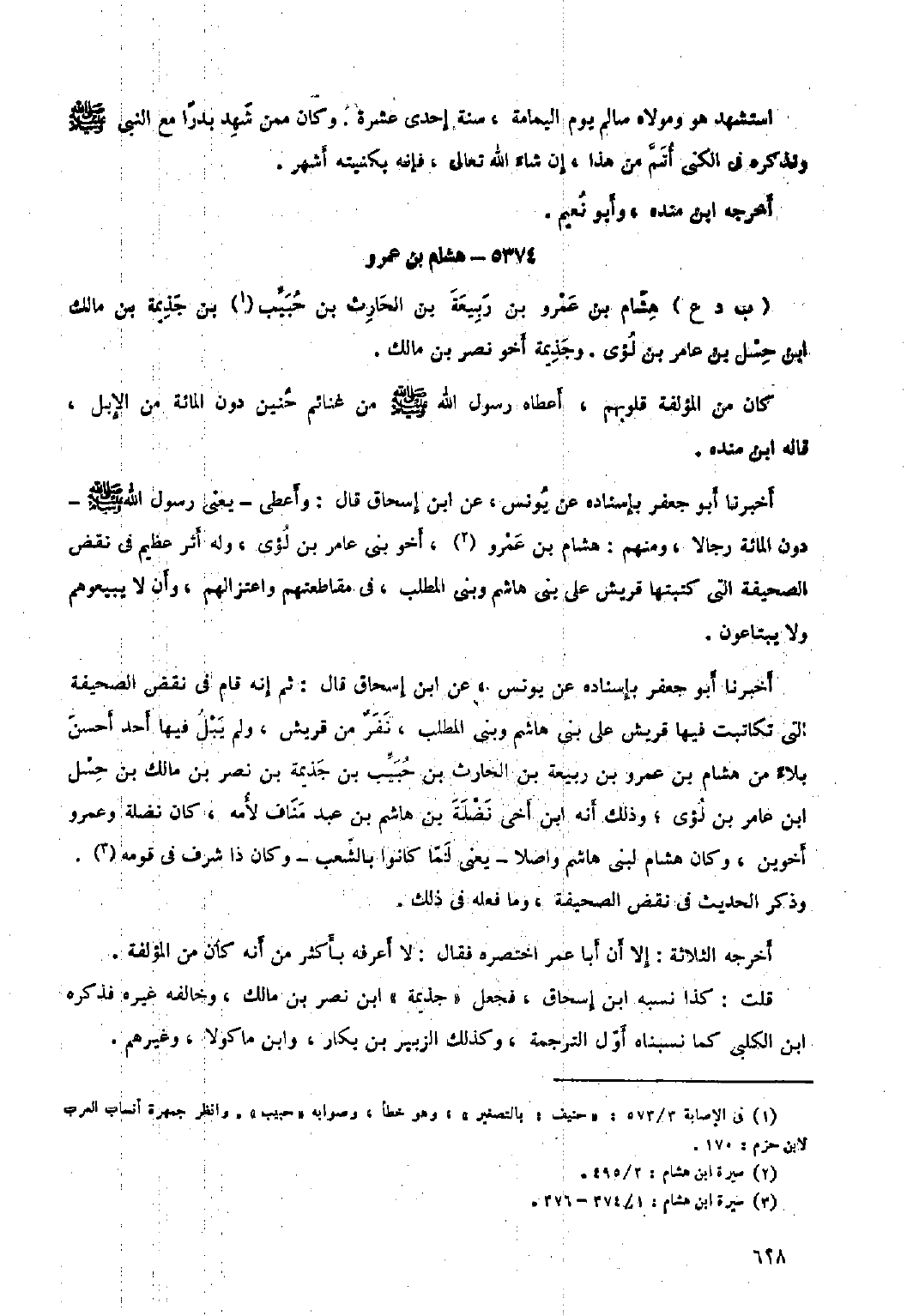أَخْبَرَنَا أَبُو جَعْفَر بِإِسْنَادِهِ عَنْ يونس، عَنِ ابن إسحاق قال: وأعطى- يعني رسول الله صلى الله عليه وسلم- دون المائة رجالا، ومنهم: هِشَام بن عَمْرو [٢] ، أخو بني عَامِر بن لؤي، وله أثر عظيم فِي نقض الصحيفة التي كتبتها قريش عَلَى بني هاشم وبني المطلب، فِي مقاطعتهم واعتزالهم، وأن لا يبيعوهم ولا يبتاعون.