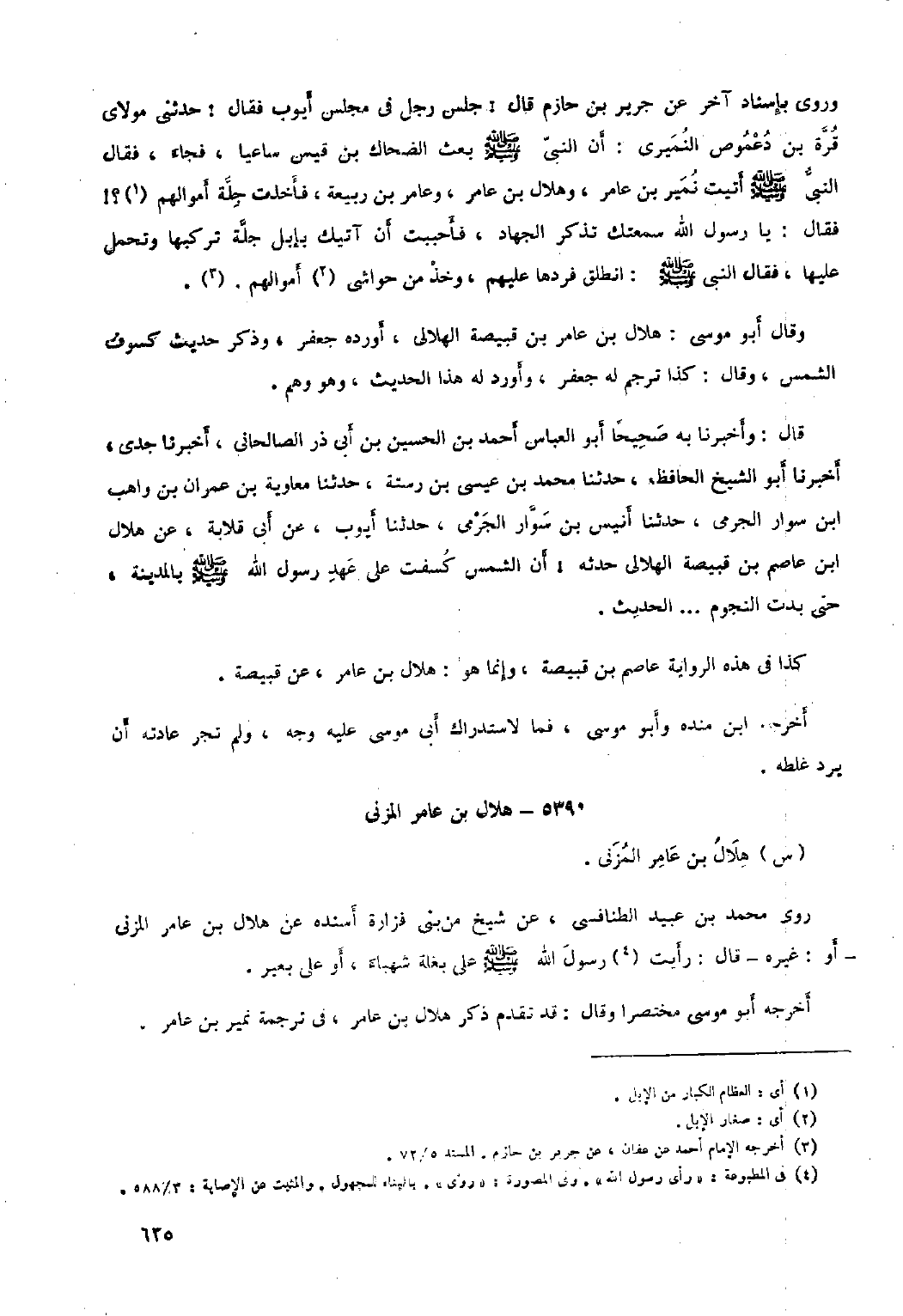 وروى بإسناد آخر عن جرير بن حازم قَالَ: جلس رجل فِي مجلس أيوب فقال: حدثني مولاي قرة بن دعموص النميري: إن النَّبِيّ صلى الله عَلَيْهِ وسلم بعث الضحاك بن قيس ساعيا، فجاء، فقال النَّبِيّ صلى الله عَلَيْهِ وسلم أتيت نمير بن عَامِر، وهلال بن عَامِر، وَعَامِر بن ربيعة، فأخذت جلة أموالهم [١] ؟! فقال: يا رسول الله سمعتك تذكر الجهاد، فأحببت أن آتيك بإبل جلة تركبها وتحمل عليها، فقال النَّبِيّ صلى الله عَلَيْهِ وسلم: انطلق فردها عليهم، وخذ من حواشي [٢] أموالهم. [٣] . وقال أبو موسى: هلال بن عَامِر بن قبيصة الهلالي، أورده جَعْفَر، وذكر حديث كسوف الشمس، وقال: كذا ترجم لَهُ جَعْفَر، وأورد لَهُ هَذَا الحديث، وهو وهم.