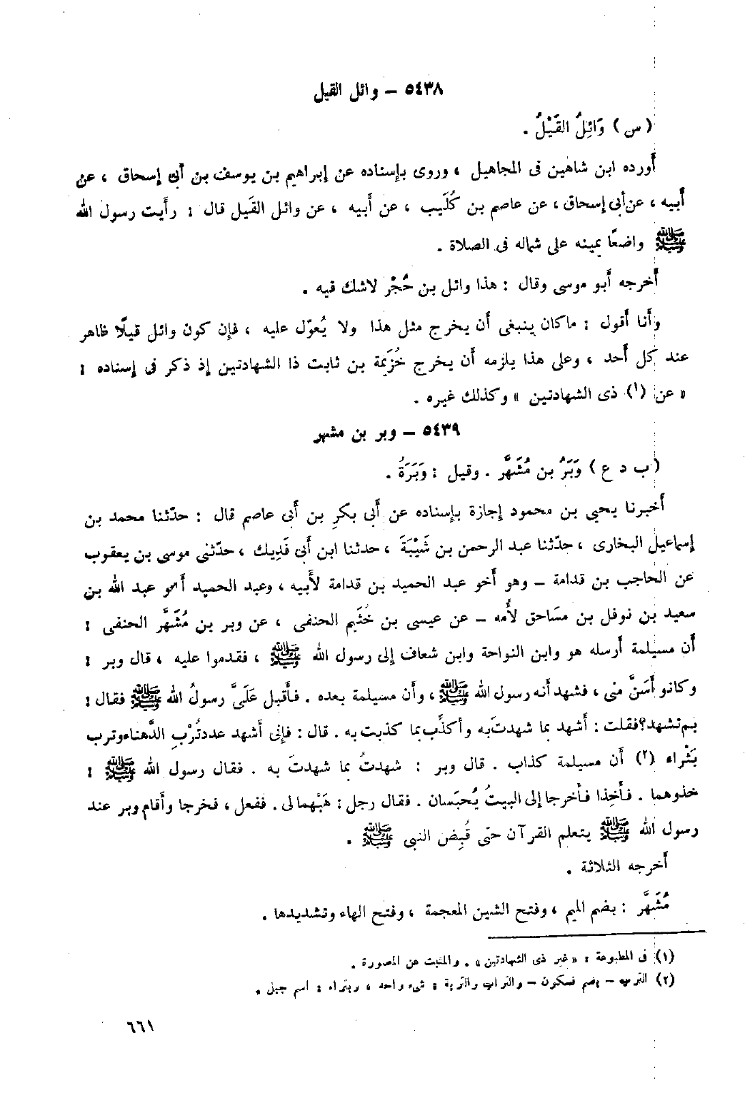أَخْبَرَنَا يَحْيَى بْنُ مَحْمُودٍ إِجَازَةً بِإِسْنَادِهِ عَنْ أَبِي بَكْرِ بْنِ أَبِي عَاصِمٍ قال: حَدَّثَنَا مُحَمَّد بن إِسْمَاعِيل البخاري، حَدَّثَنَا عبد الرحمن بن شيبة، حَدَّثَنَا ابن أبي فديك، حَدَّثَنِي موسى بن يَعْقُوب عن الحاجب بن قدامة- وهو أخو عبد الحميد بن قدامة لأبيه، وعبد الحميد أخو عبد الله بن سعيد بن نوفل بن مساحق لأمه- عن عيسى بن خثيم الحنفي، عن وبر بن مشهر الحنفي: أن مسيلمة أرسله هُوَ وابن النواحة وابن شعاف إلى رسول الله صلى الله عَلَيْهِ وسلم، فقدموا عَلَيْهِ، قَالَ وبر: