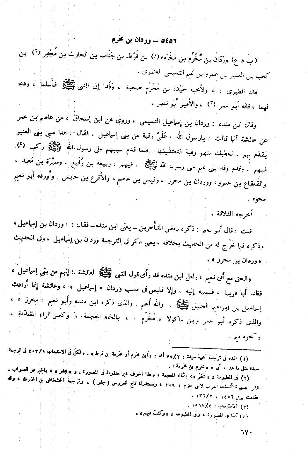 والحق مع أبى نعيم، ولعل ابن منده قد رأى قول النَّبِيّ صلى الله عَلَيْهِ وسلم لعائشة: إنهم من بني إِسْمَاعِيل، فظنه أبا قريبا، فنسبه إليه، وإلا فليس فِي نسب وردان «إِسْمَاعِيل» ، وعائشة إنما أرادت إِسْمَاعِيل بن إِبْرَاهِيِم الخليل صلى الله عَلَيْهِ وسلم، والله أعلم. وَالَّذِي ذكره ابن منده وأبو نعيم «محرز» ، وَالَّذِي ذكره أبو عمر وابن ماكولا «مخرم» ، بالخاء المعجمة، وكسر الراء المشدّدة، وآخره ميم.