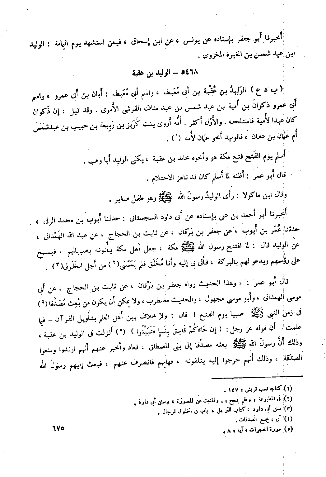 قَالَ أبو عمر: «وهذا الحديث رواه جَعْفَر بن برقان، عن ثابت بن الحجاج، عن أبي موسى الهمداني، وَأَبُو موسى مجهول، والحديث مضطرب، ولا يمكن أن يكون من بعث مصدقا [٤] فِي زمن النَّبِيّ صَلَّى اللَّهُ عَلَيْهِ وَسَلَّمَ صبيا يوم الفتح! قَالَ: ولا خلاف بين أهل العلم بتأويل القرآن- فيما علمت- أن قَوْله عَزَّ وَجَلَّ: إِنْ جاءَكُمْ فاسِقٌ بِنَبَإٍ فَتَبَيَّنُوا ٤٩: ٦ [٥] أنزلت فِي الوليد بن عقبة، وَذَلِكَ أَنَّ رَسُول اللَّهِ صَلَّى اللَّهُ عَلَيْهِ وسلم بعثه مصدقا إلى بني المصطلق، فعاد وأخبر عنهم أنهم ارتدوا ومنعوا الصدقة، وَذَلِكَ أنهم خرجوا إليه يتلقونه، فهابهم فانصرف عنهم، فبعث إليهم رسول الله