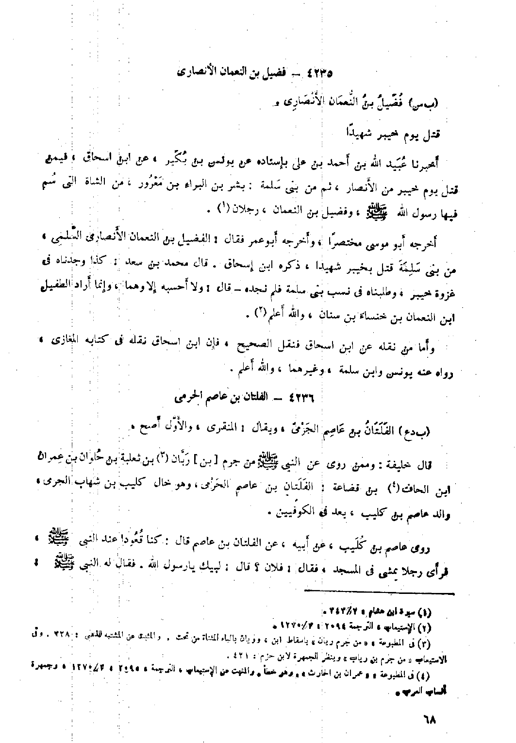 قتل يَوْم خيبر شهيدا أَخْبَرَنَا عُبَيْد اللَّه بْن أحمد بن عَليّ بإسناده عن يونس بن بكير، عَنِ ابْنِ إِسْحَاق، فيمن قتل يَوْم خيبر من الأنصار، ثُمَّ من بني سَلَمة: بشر بْن البراء بْن معرور، من الشاة التي سم فيها رَسُول اللَّه صَلَّى اللَّهُ عليه وآله وَسَلَّمَ، وفضيل بْن النعمان، رجلان [١] .