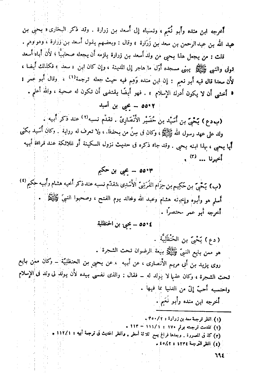 قلت: من يجعل هَذَا يَحْيَى من ولد أسعد بن زرارة يلزمه أن يجعله صحابيا، لأن أباه أسعد توفي والنبي صلى الله عَلَيْهِ وسلم يبني مسجده أول ما هاجر إلى المدينة، وإن كان ابن «سعد» فكذلك أيضا، لأن سعدا قَالَ فِيهِ أَبُو نعيم: إن ابن منده وهم فِيهِ حَيْثُ جعله ترجمة [١] ، وقال أبو عمر: