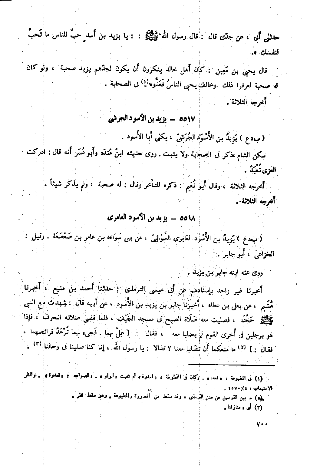 أَخْبَرَنَا غير واحد بٍإسنادهم عَنْ أَبِي عِيسَى الترمذي: حَدَّثَنَا أحمد بن منيع، أخبرنا هشيم، عن يعلى بن عطاء، أخبرنا جابر بْن يَزِيدَ بْن الأسود، عَنْ أبيه قَالَ: شهدت مَعَ النَّبِيّ صَلَّى اللَّهُ عَلَيْهِ وسلم حجته، فصليت معه صلاة الصبح فِي مسجد الخيف، فلما قضى صلاته انحرف، فإذا هُوَ برجلين فِي أخرى القوم لَمْ يصليا معه، فقال: [عَليّ بهما. فجيء بهما ترعد فرائصهما، فقال:] [٢] ما منعكما أن تصليا معنا؟ فقالا: يا رسول الله، إنا كنا صلينا فِي رحالنا [٣] .