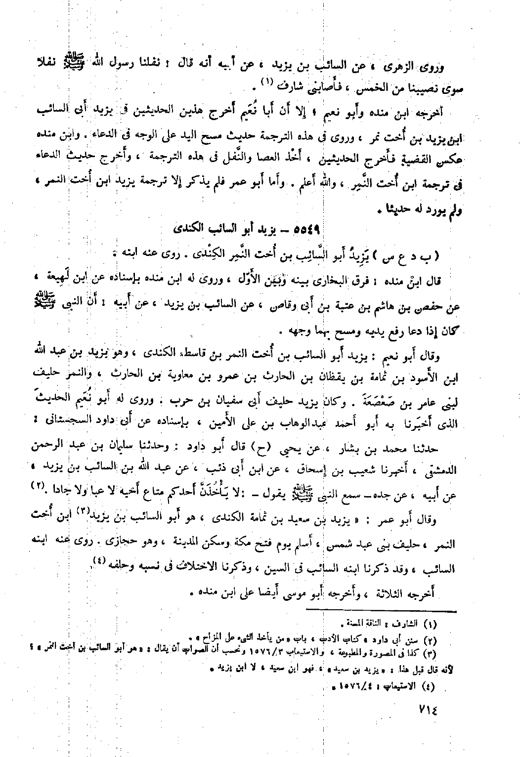 قَالَ ابن منده: فرق البخاري بينه وبين الأول، وروى لَهُ ابن منده بإسناده عن ابن لهيعة، عن حَفْص بْن هاشم بْن عتبة بْن أَبِي وقاص، عن السائب بن يزيد، عن أبيه: أن النبي صلى الله عليه وسلم كَانَ إذا دعا رفع يديه ومسح بهما وجهه. وقال أبو نعيم: يزيد أَبُو السائب بن أخت النمر بن قاسط الكندي، وهو يزيد بن عبد الله ابن الأسود بن ثمامة بن يقظان بْن الحارث بْن عَمْرو بْن معاوية بن الحارث، والنمر حليف لبني عَامِر بن صعصعة. وَكَانَ يزيد حليف أبي سفيان بن حرب. وروى لَهُ أبو نعيم الحديث الَّذِي أَخْبَرَنَا بِهِ أَبُو أَحْمَدَ عَبْدُ الْوَهَّابِ بْنُ عَلِيٍّ الأَمِينُ، بِإِسْنَادِهِ عَنْ أَبِي دَاوُدَ السِّجِسْتَانِيِّ: