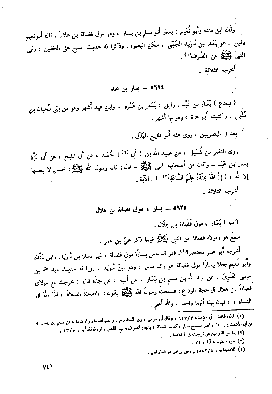 أَخْرَجَهُ أَبُو عُمَر مختصرا [٤] . فهو قد جعل يسارا مولى فضالة، غير يسار بن سويد. وابن منده وَأَبُو نعيم جعلا يسارا مولى فضالة هُوَ والد مسلم، وهو ابن سويد، رويا لَهُ حديث عبد الله بن موسى العلوي، عن عبد الله بن مسلم بن يسار، عن أبيه، عن جده قَالَ: خرجت مع مولاي فضالة بن هلال فِي حجة الوداع، فسمعت رسول الله صلى الله عَلَيْهِ وسلم يقول: «الصلاة الصلاة، الله الله فِي النساء» ، فبان بهذا أنهما واحد، والله أعلم.