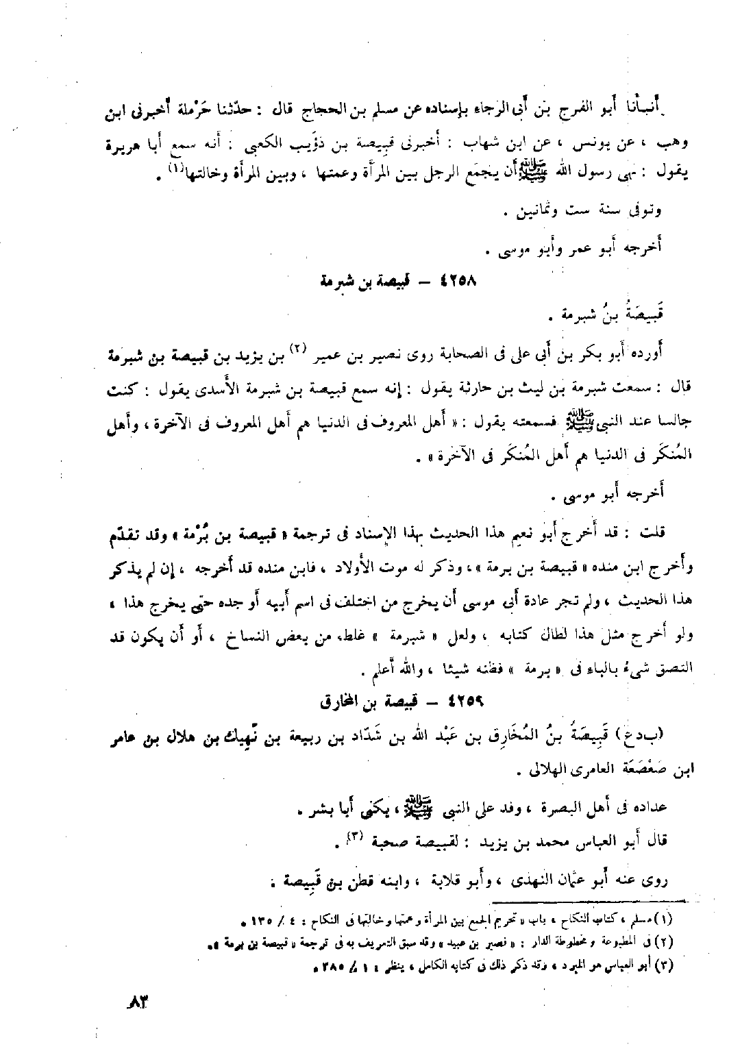 أَنْبَأَنَا أَبُو الْفَرَجِ بْنُ أَبِي الرَّجَاءِ بِإِسْنَادِهِ عَنْ مُسْلِمِ بْنِ الْحَجَّاجِ قَالَ: حَدَّثَنَا حَرْمَلَةُ أَخْبَرَنِي ابْنُ وَهْبٍ، عَنْ يُونُسَ، عَنِ ابْنِ شِهَابٍ: أَخْبَرَنِي قَبِيصَةُ بْنُ ذُؤَيْبٍ الْكَعْبِيُّ: أَنَّهُ سَمِعَ أَبَا هُرَيْرَةَ يَقُولُ: نَهَى رَسُولُ اللَّهِ صلّى الله عليه وآله وَسَلَّمَ أَنْ يَجْمَعَ الرَّجُلُ بَيْنَ الْمَرْأَةِ وَعَمَّتِهَا، وَبَيْنَ الْمَرْأَةِ وَخَالَتِهَا [١] . وتوفي سنة ست وثمانين.
