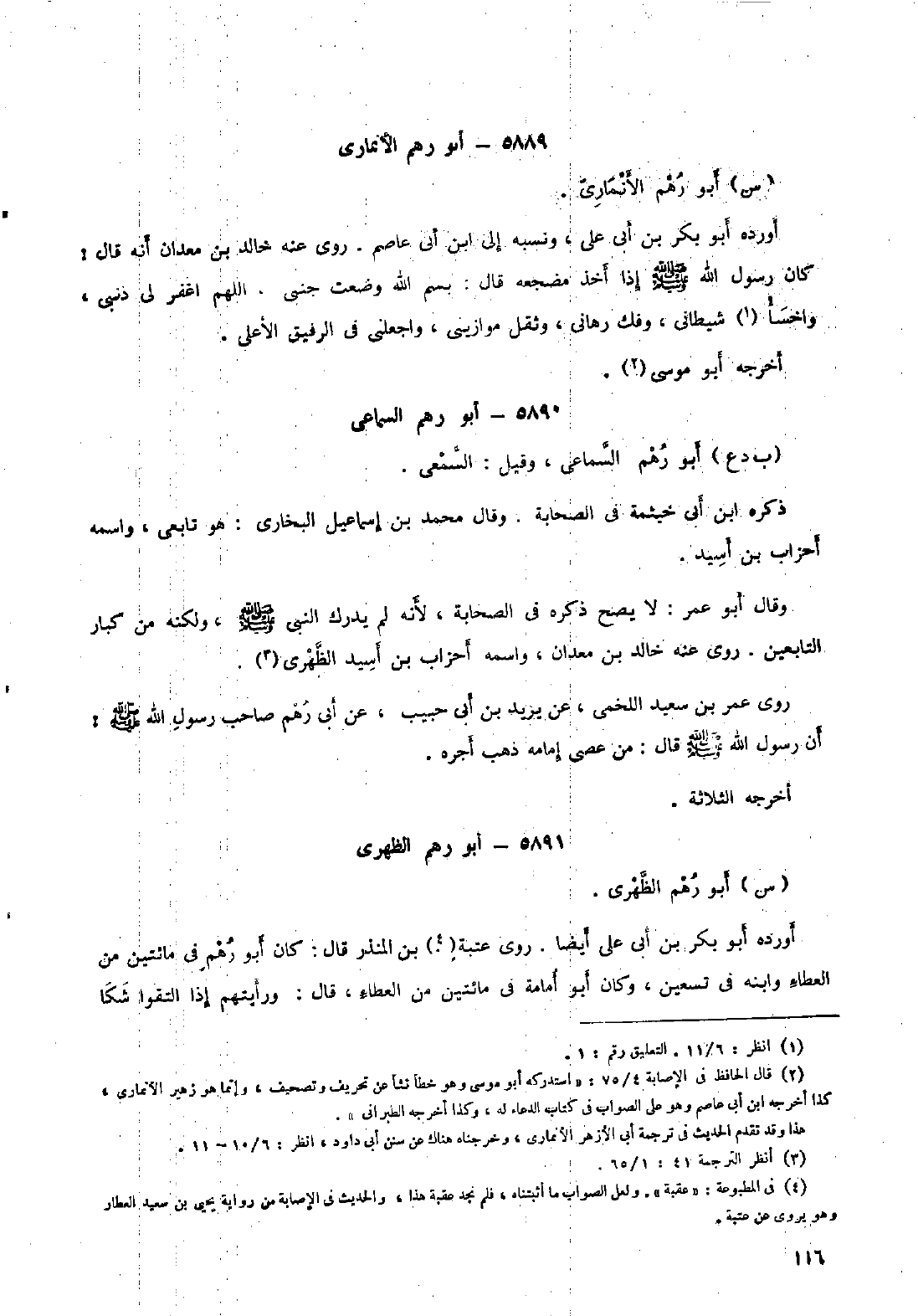 وقال أبو عمر: لا يصح ذكره فِي الصحابة، لأنه لَمْ يدرك النَّبِيّ صلى الله عَلَيْهِ وسلم، ولكنه من كبار التابعين. روى عَنْهُ خالد بن معدان، واسمه أحزاب بن أسيد الظهري [٣] .