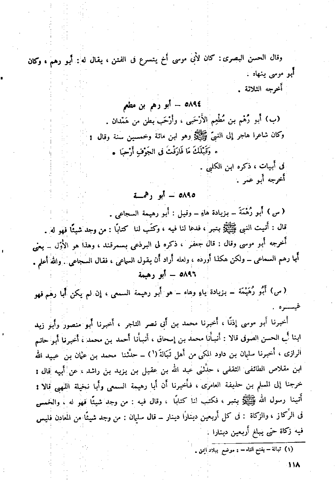 أخبرنا أبو موسى إذنا، أخبرنا مُحَمَّد بن أبي نصر التاجر، أخبرنا أبو منصور وَأَبُو زيد ابنا أبي الْحَسَن الصوفي قالا: أَنْبَأَنَا مُحَمَّد بن إسحاق، أَنْبَأَنَا أحمد بن مُحَمَّد، أخبرنا أبو حاتم الرازي، أخبرنا سُلَيْمَان بن داود المكي من أهل تبالة [١]- حَدَّثَنَا مُحَمَّد بن عثمان بن عُبَيْد الله ابن مقلاص الطائفي الثقفي، حَدَّثَنِي عبد الله بن عقيل بن يزيد بن راشد، عن أبيه قال: خرجنا إلى المسلم بن حذيفة العامري، فأخبرنا أن أبا رهيمة السمعي وأبا نخيلة اللهبي قالا: