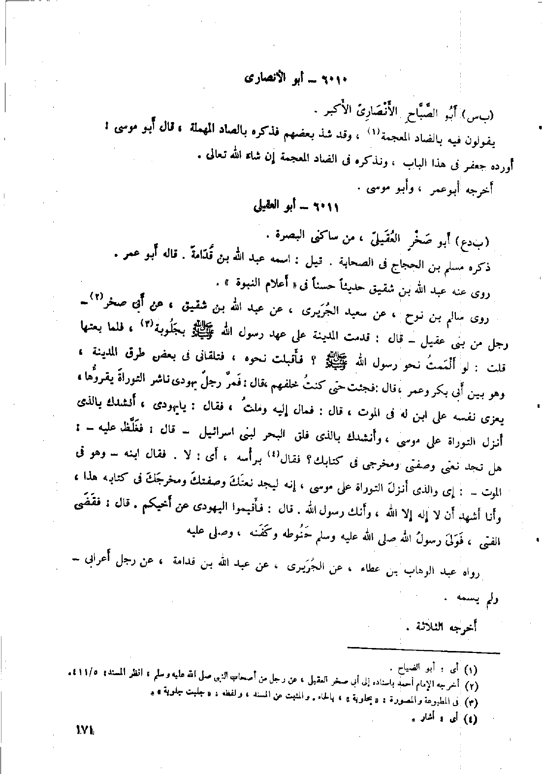 هل تجد نعتي وصفتي ومخرجي في كتابك؟ فقال [٤] برأسه، أي: لا. فقال ابنه- وهو في الموت-: إي والّذي أنزل التوراة على موسى، إنه ليجد نعتك وصفتك ومخرجك في كتابه هذا، وأنا أشهد أن لا إله إلا اللَّه، وأنك رسول الله. قال: فأقيموا اليهودي عن أخيكم. قال: فقضى الفتى، فولي رسول الله صلى الله عليه وسلم حنوطه وكفنه، وصلى عليه رواه عبد الوهاب بن عطاء، عن الجريري، عن عبد الله بن قدامة، عن رجل أعرابي- ولم يسمه.