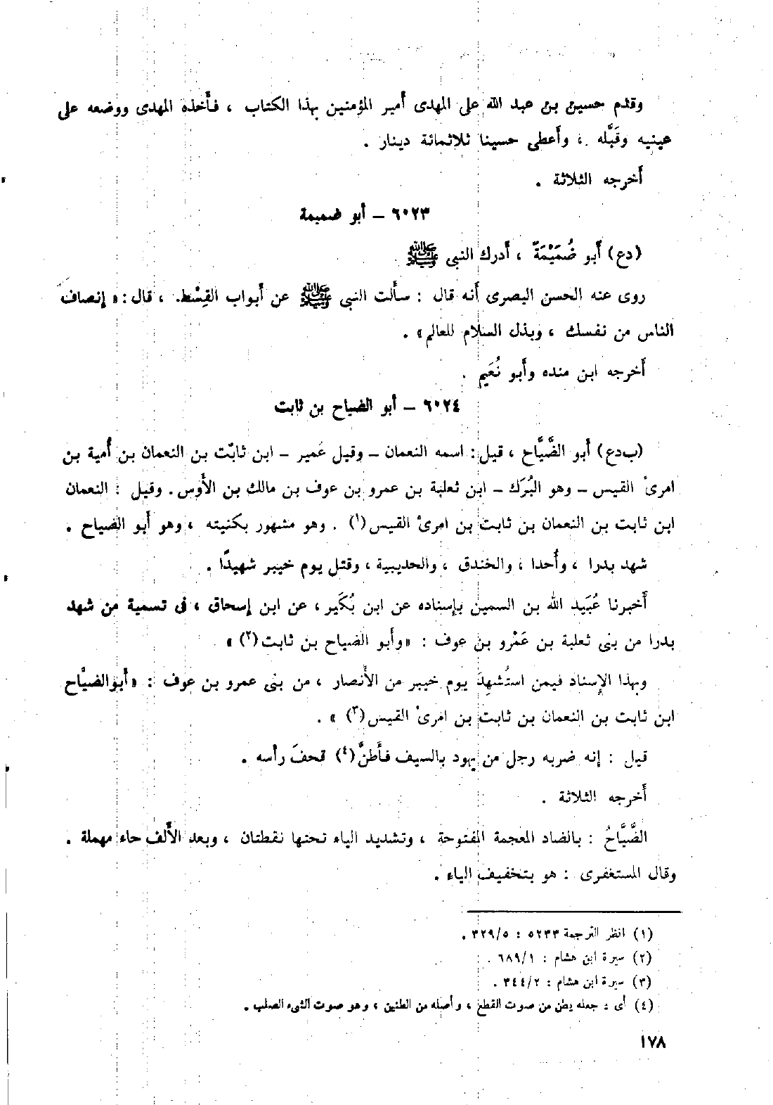 وبهذا الإسناد فيمن استشهد يوم خيبر من الأنصار، من بني عمرو بْن عوف: «أبو الضّياح ابن ثابت بن النعمان بن ثابت بن امرئ القيس [٣] » .