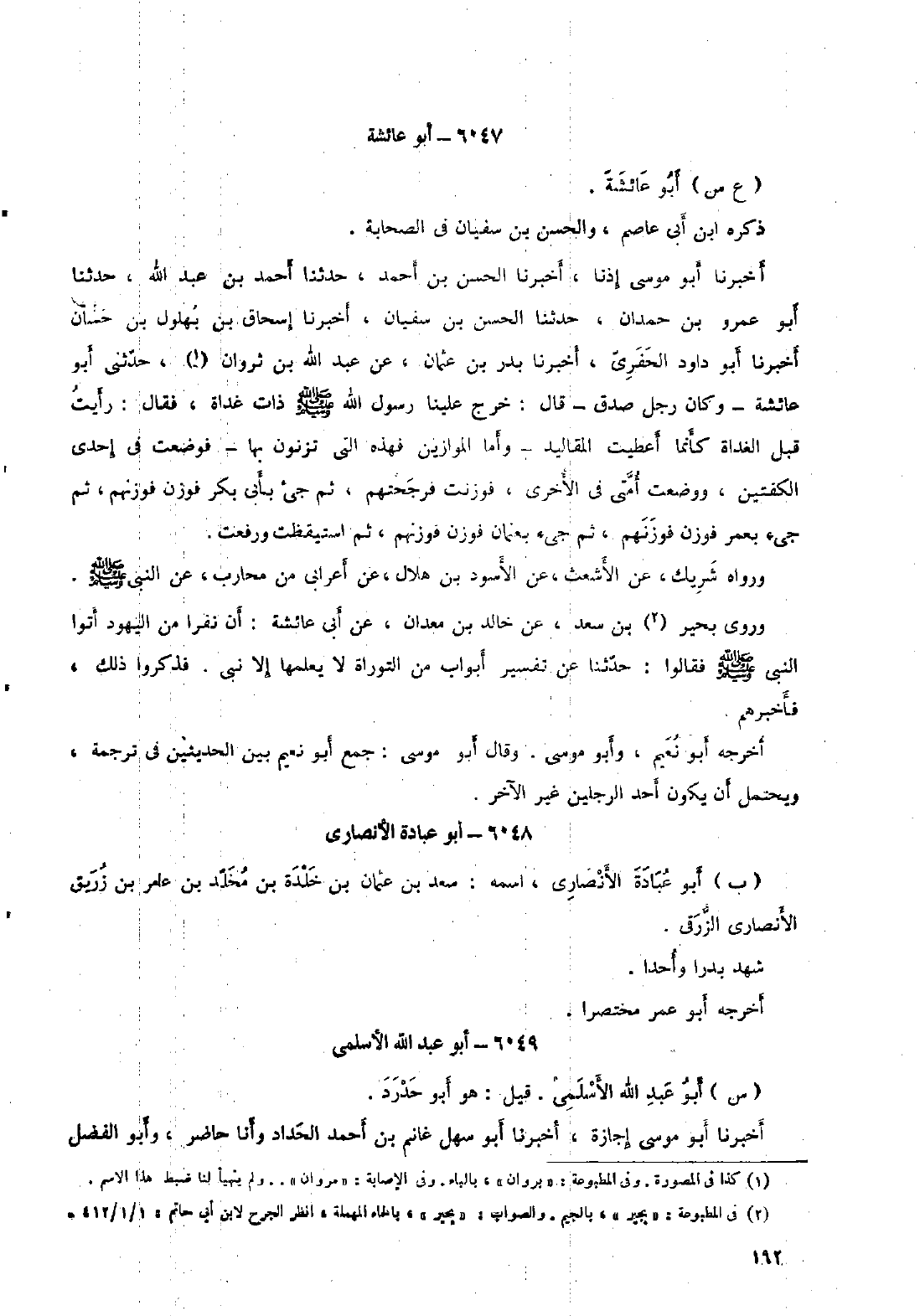 أَخْبَرَنَا أَبُو مُوسَى إِذْنًا، أَخْبَرَنَا الْحَسَنُ بْنُ أحمد، حدثنا أَحْمَدُ بْنُ عَبْدِ اللَّهِ، حَدَّثَنَا أَبُو عَمْرِو بْنُ حَمْدَانَ، حَدَّثَنَا الْحَسَنُ بْنُ سفيان، أخبرنا إسحاق بن بهلول بن حسان أخبرنا أبو داود الحفري، أخبرنا بدر بن عثمان، عن عبد الله بن ثروان [١] ، حدثني أبو عائشة- وكان رجل صدق- قال: خرج علينا رسول الله صلى الله عليه وسلم ذات غداة، فقال: رأيت قبل الغداة كأنما أعطيت المقاليد- وأما الموازين فهذه التي تزنون بها- فوضعت في إحدى الكفتين، ووضعت أمتي في الأخرى، فوزنت فرجحتهم، ثم جيء بأبي بكر فوزن فوزنهم، ثم جيء بعمر فوزن فوزنهم، ثم جيء بعثمان فوزن فوزنهم، ثم استيقظت ورفعت.