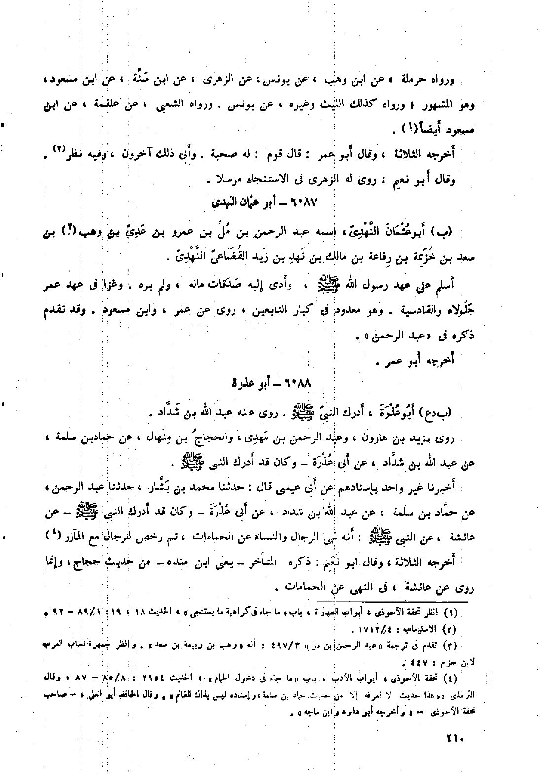 (ب) أبو عثمان النهدي، اسمه عبد الرحمن بن مل بن عمرو بن عدي بن وهب [٣] بن سعد بن خزيمة بْن رفاعة بْن مَالِك بْن نهد بْن زيد القضاعي النهدي.