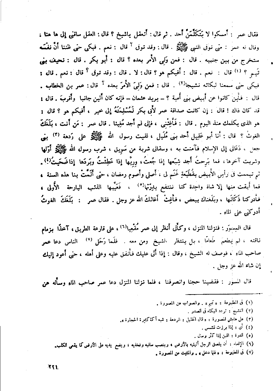 قال المسور: فنزلنا المنزل، وكأني أنظر إلى عمر مقعيا [٦] ، على قارعة الطريق، آخذا بزمام ناقته، لم يطعم طعاما، بل ينتظر الشيخ ومن معه. فلما رحل [٧] الناس دعا عمر صاحب الماء، فوصف له الشيخ، وقال: إذا أتى عليك فأنفق عليه وعلى أهله، حتى أعود إليك إن شاء الله عز وجل.