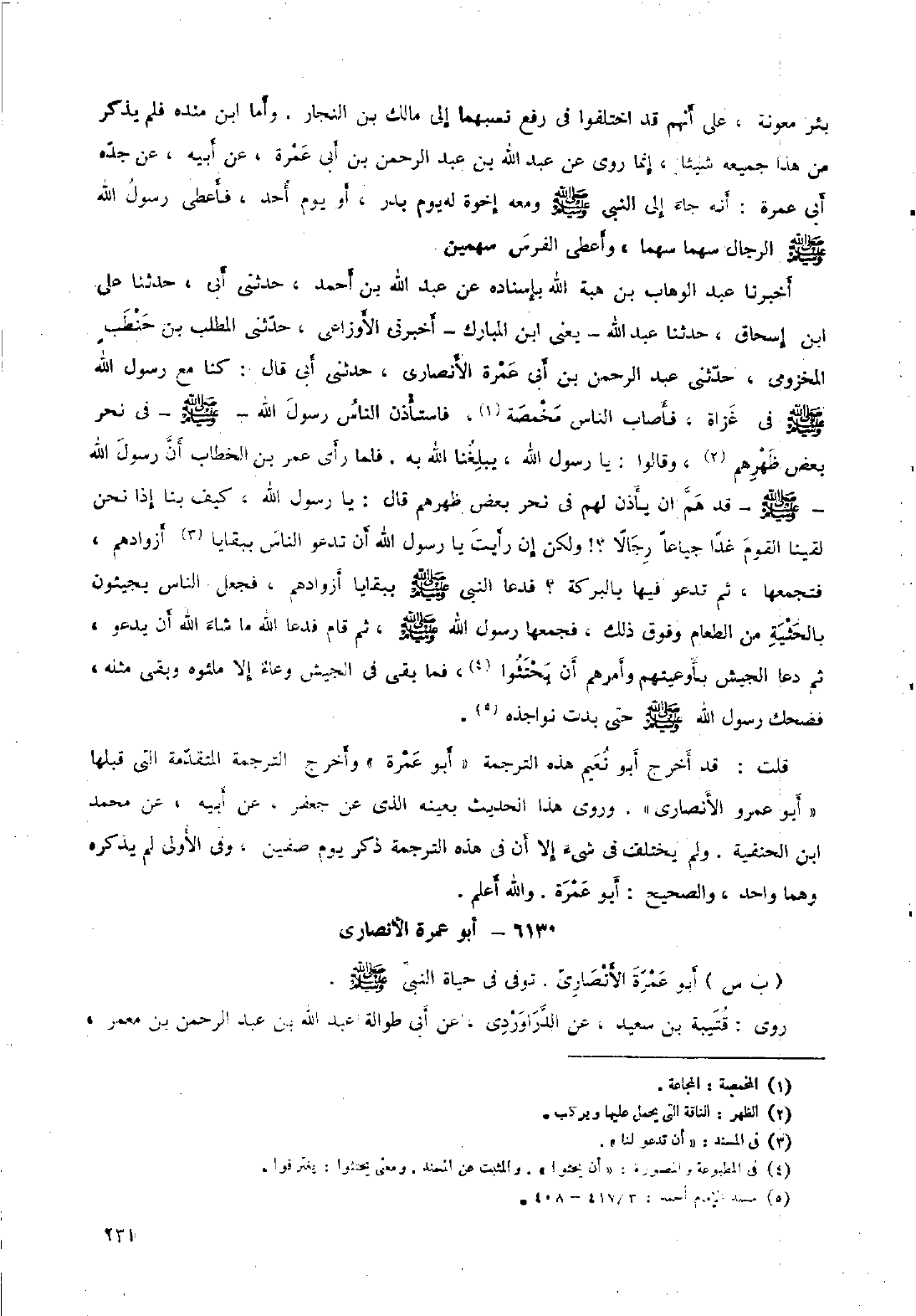 بئر معونة، على أنهم قد اختلفوا في رفع نسبهما إلى مالك بن النجار. وأما ابن منده فلم يذكر من هذا جميعه شيئا، إنما روى عَنْ عَبْد اللَّهِ بْن عَبْدِ الرَّحْمَنِ بْن أبي عمرة، عن أبيه، عَنْ جده أَبِي عمرة: أَنَّهُ جاء إِلَى النَّبِيّ صَلَّى اللَّهُ عَلَيْهِ وَسَلَّمَ ومعه إخوة له يوم بدر، أو يوم أحد، فأعطى رَسُول اللَّهِ صَلَّى اللَّهُ عَلَيْهِ وَسَلَّمَ الرجال سهماً سهماً، وأعطى الفرس سهمين أخبرنا عبد الوهاب بن هبة الله بإسناده عن عبد الله بن أحمد، حدثني أبي، حدثنا علي ابن إسحاق، حدثنا عبد الله- يعني ابن المبارك- أخبرني الأوزاعي، حدثني المطلب بن حنطب المخزومي، حدثني عبد الرحمن بن أبي عمرة الأنصاري، حدثني أبي قال: كنا مع رسول الله صلى الله عليه وسلم في غزاة، فأصاب الناس مخمصة [١] ، فاستأذن الناس رَسُول اللَّهِ- صَلَّى اللَّهُ عَلَيْهِ وَسَلَّمَ- في نحر بعض ظهرهم [٢] ، وقالوا: يا رسول الله، يبلغنا الله به. فلما رأى عمر بْن الخطاب أن رَسُول اللَّهِ- صَلَّى اللَّهُ عليه وسلم- قد هم أن يأذن لهم في نحر بعض ظهرهم قال: يا رسول الله، كيف بنا إذا نحن لقينا القوم غداً جياعاً رجالاً؟! ولكن إن رأيت يا رسول الله أن تدعو الناس ببقايا [٣] أزوادهم، فتجمعها، ثم تدعو فيها بالبركة؟ فدعا النبي صلى الله عليه وسلم ببقايا أزوادهم، فجعل الناس يجيئون بالحثية من الطعام وفوق ذلك، فجمعها رسول الله صلى الله عليه وسلم، ثم قام فدعا الله ما شاء الله أن يدعو، ثم دعا الجيش بأوعيتهم وأمرهم أن يحتثوا [٤] ، فما بقي في الجيش وعاء إلا ملئوه وبقي مثله، فضحك رَسُول اللَّهِ صَلَّى اللَّهُ عَلَيْهِ وَسَلَّمَ حتى بدت نواجذه [٥] .