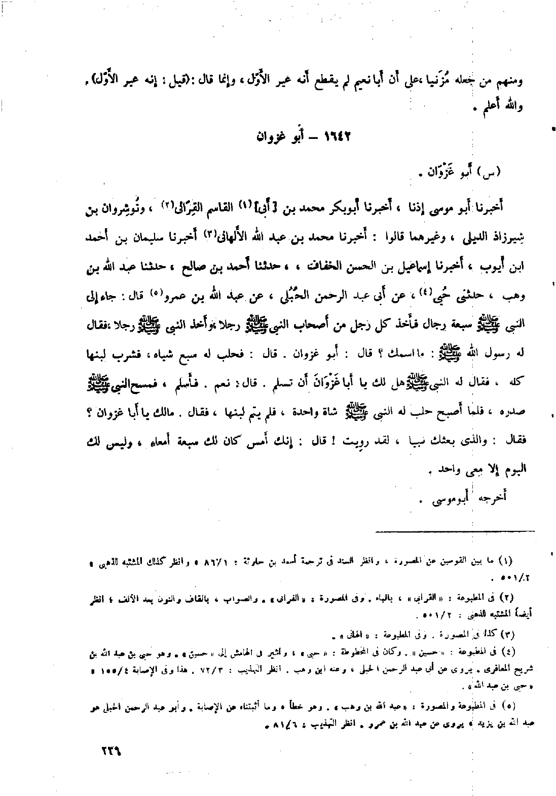 أَخْبَرَنَا أَبُو مُوسَى إِذْنًا، أَخْبَرَنَا أَبُو بَكْرٍ محمد بن [أبي] [١] القاسم القراني [٢] ، ونوشروان بن شيرزاذ الديلي، وغيرهما قالوا: أخبرنا محمد بن عبد الله الألهاني [٣] أخبرنا سليمان بن أحمد ابن أيوب، أخبرنا إسماعيل بن الحسن الخفاف، حدثنا أحمد بن صالح، حدثنا عبد الله بن وهب، حدثني حيي [٤] ، عن أبي عبد الرحمن الحبلي، عن عبد الله بن عمرو [٥] قال: جاء إِلَى النَّبِيّ صَلَّى اللَّهُ عَلَيْهِ وَسَلَّمَ سبعة رجال فأخذ كل رجل من أصحاب النبي صلى الله عليه وسلم رجلا، وأخذ النبي صلى الله عليه وسلم رجلا، فقال له رسول الله صلى الله عليه وسلم: ما اسمك؟ قال: أبو غزوان. قال: فحلب له سبع شياه، فشرب لبنها كله، فقال له النبي صلى الله عليه وسلم هل لك يا أبا غزوان أن تسلم. قال: نعم. فأسلم، فمسح النبي صلى الله عليه وسلم صدره، فلما أصبح حلب له النبي صلى الله عليه وسلم شاة واحدة، فلم يتم لبنها، فقال. مالك يا أبا غزوان؟